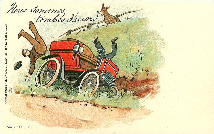 donkey looks down on two men falling out of car as it hits bank, same image, English back 641 IT HAS UPSET, 1790 A RUN ON THE BANK