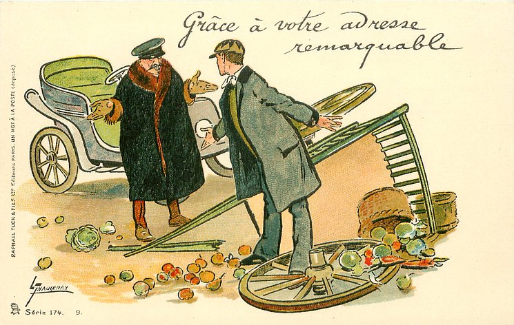 motorist has wrecked vegetable & fruit cart cart, same image, English back 622 SO SORRY & 1790 A FRIENDLY EXAMINATION