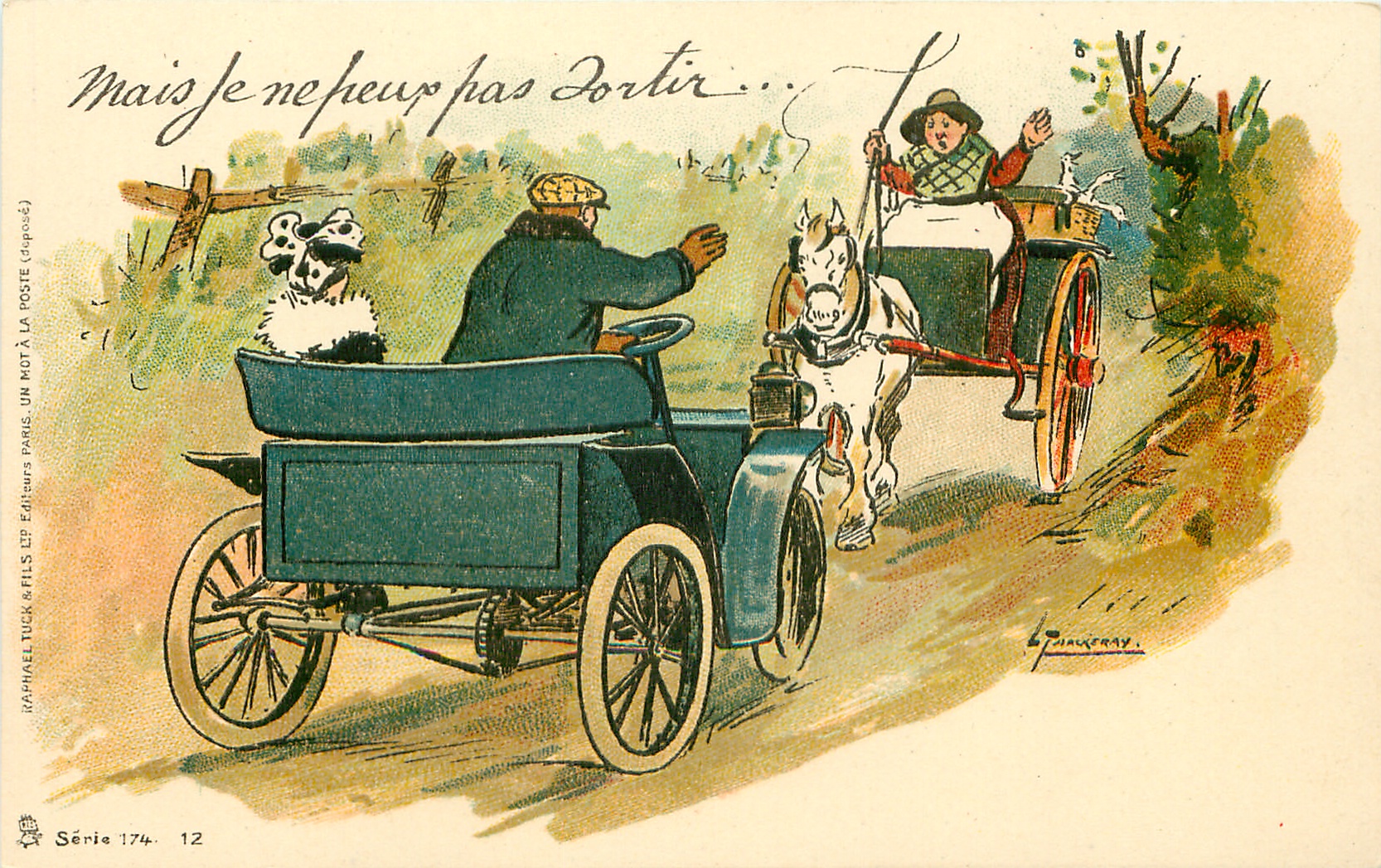 car meets horse & trap in narrow lane, same image, English back 622 IT'S NOT MY FAULT, 1790 TOWN AGAINST COUNTRY greeting,