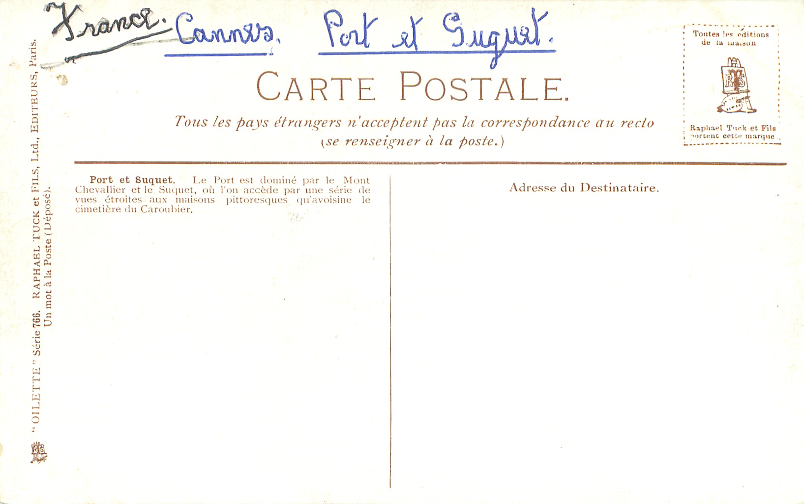 OILETTE, UN MOT A LA POSTE (DEPOSE), 5 backs, with or w/o suffix P, with or w/o COLLECTION VILLES DE FRANCE with or w/o inset numbers, same images English backs OILETTE WIDE-WIDE-WORLD 7445 CANNES SERIES I, same images & front titles with German backs as OILETTE 226 B