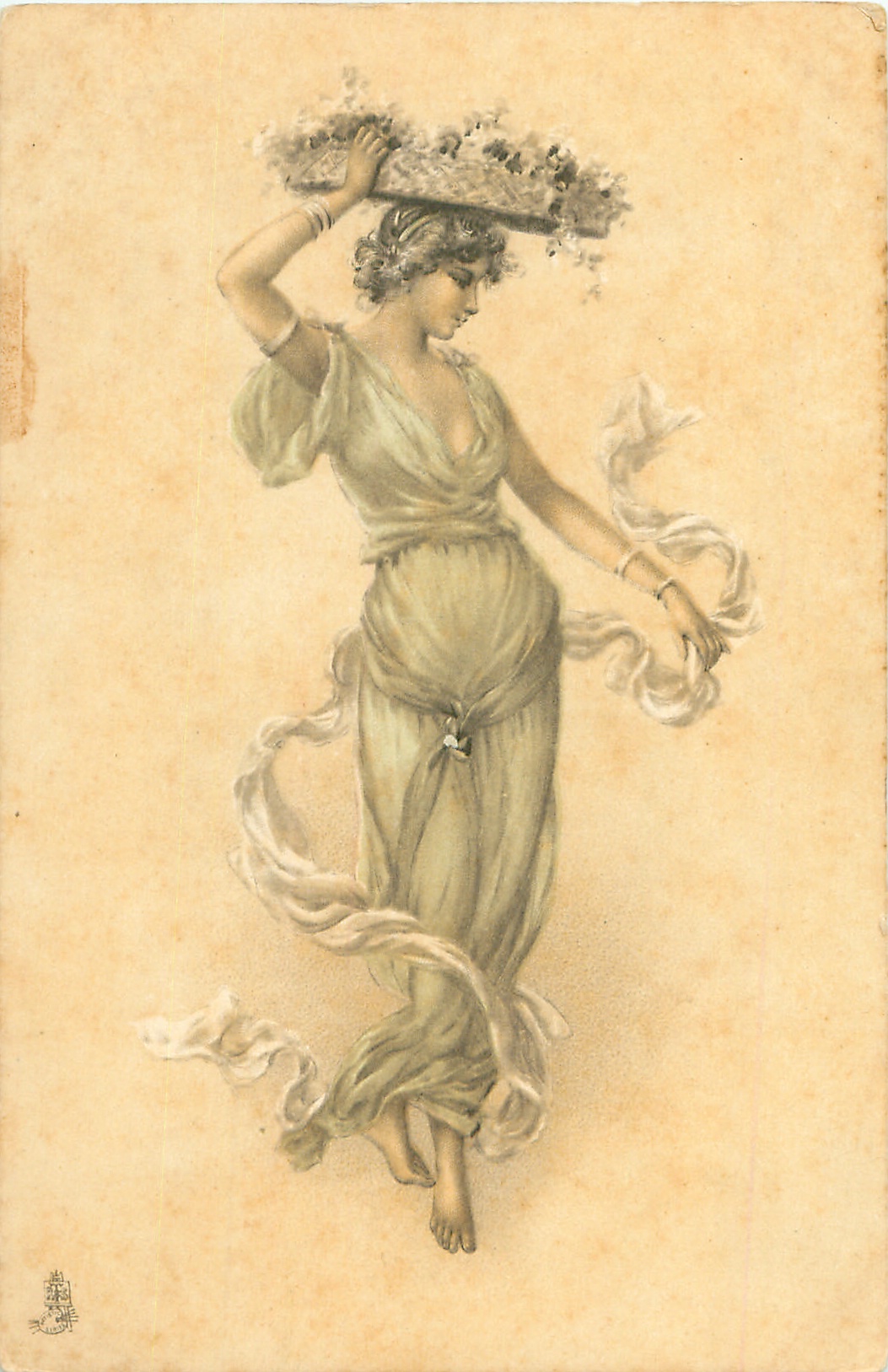 girl in green walks front bare-foot carrying basket of flowers on her head, looking right, ribbons float around her