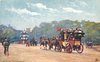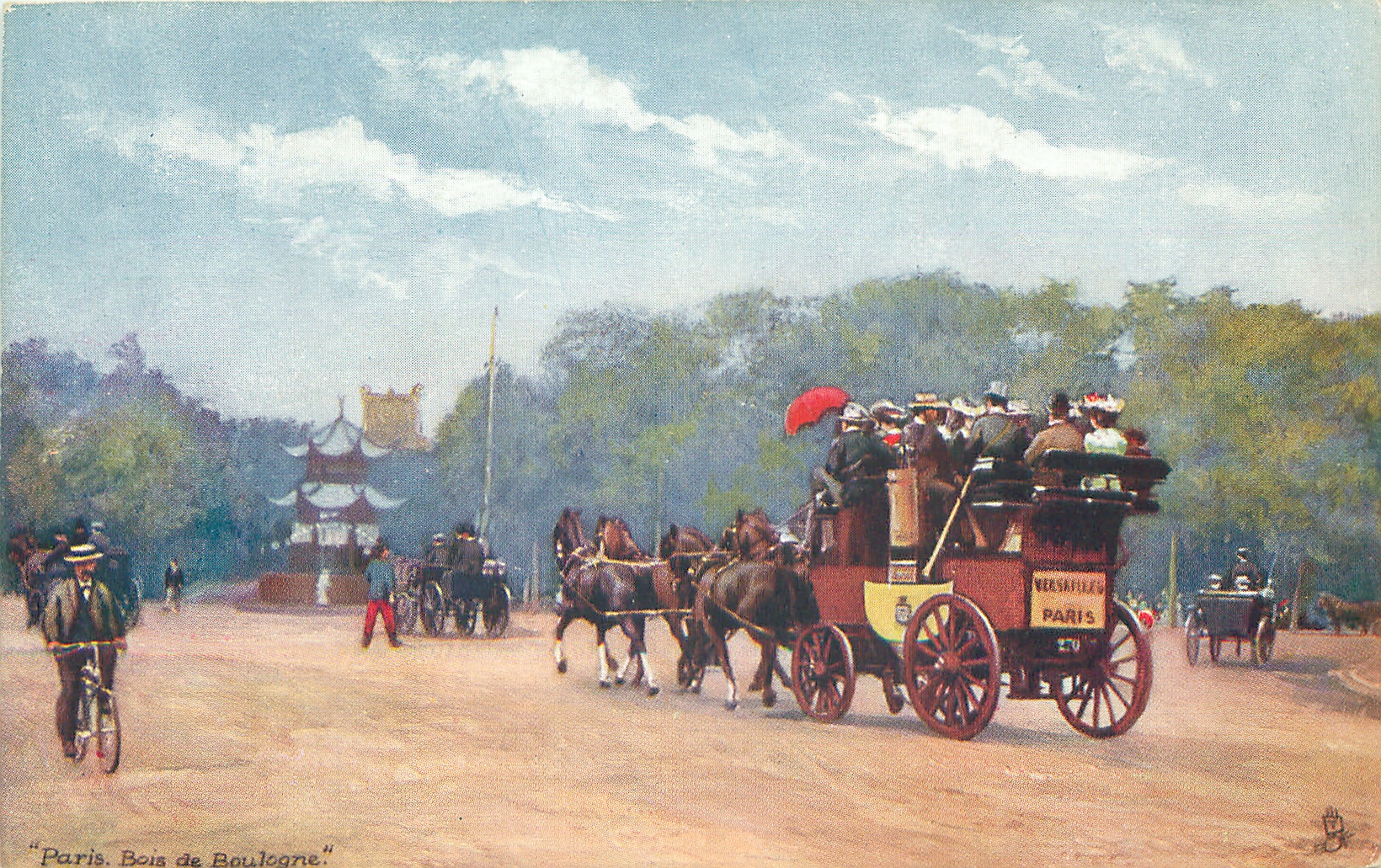 four horse bus moves away towards distant pagoda, cyclist left