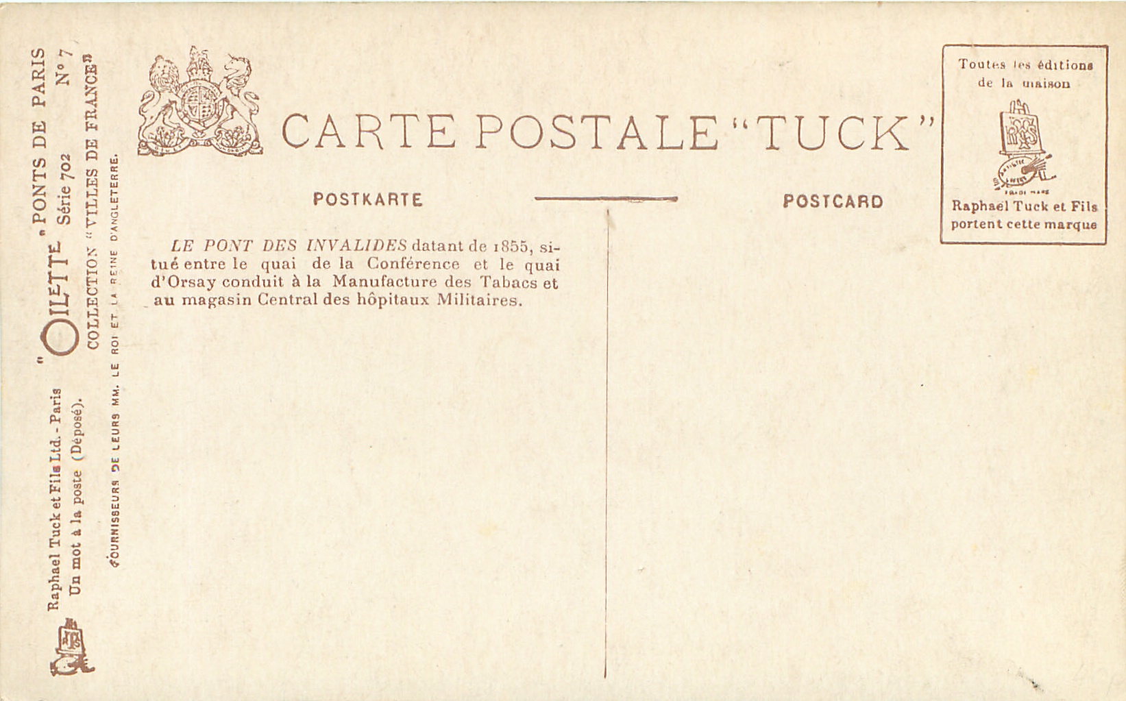 OILETTE, UN MOT A LA POSTE (DEPOSE), COLLECTION VILLES DE FRANCE, 3 backs, most of same images come in SERIE 702 without inset numbers, same images English backs OILETTE WIDE-WIDE-WORLD 7379 & 7380 PARIS BRIDGES I & II