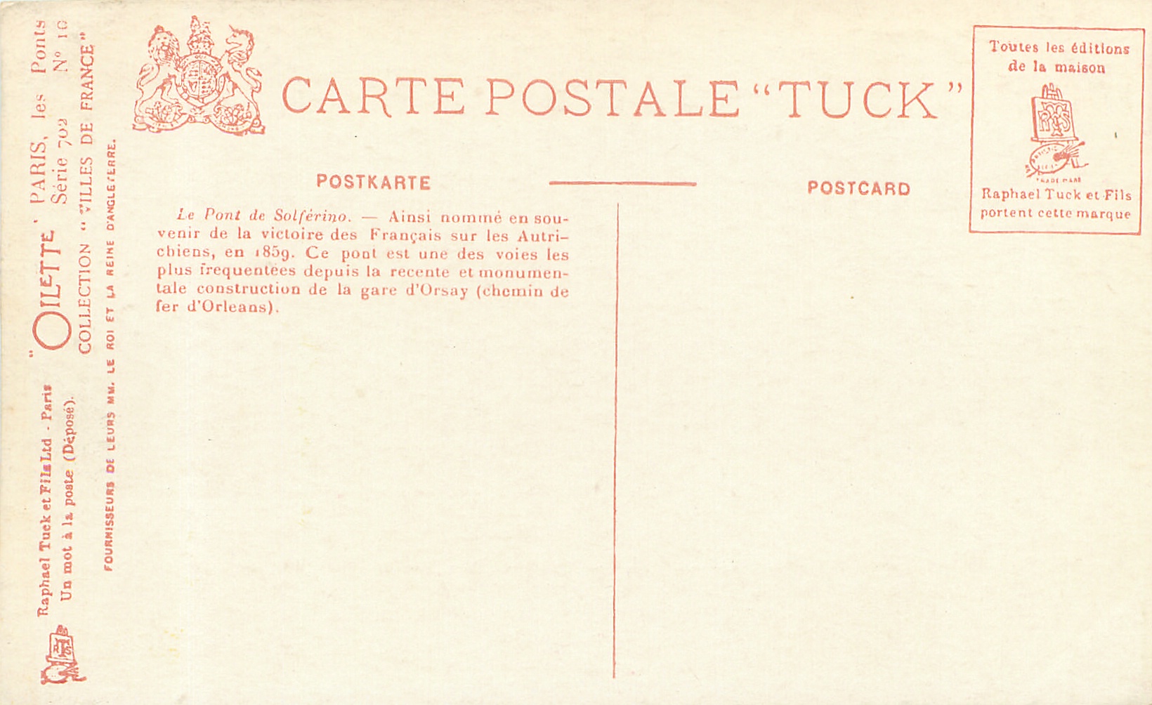 OILETTE, UN MOT A LA POSTE (DEPOSE), COLLECTION VILLES DE FRANCE, 3 backs, most of same images come in SERIE 702 without inset numbers, same images English backs OILETTE WIDE-WIDE-WORLD 7379 & 7380 PARIS BRIDGES I & II