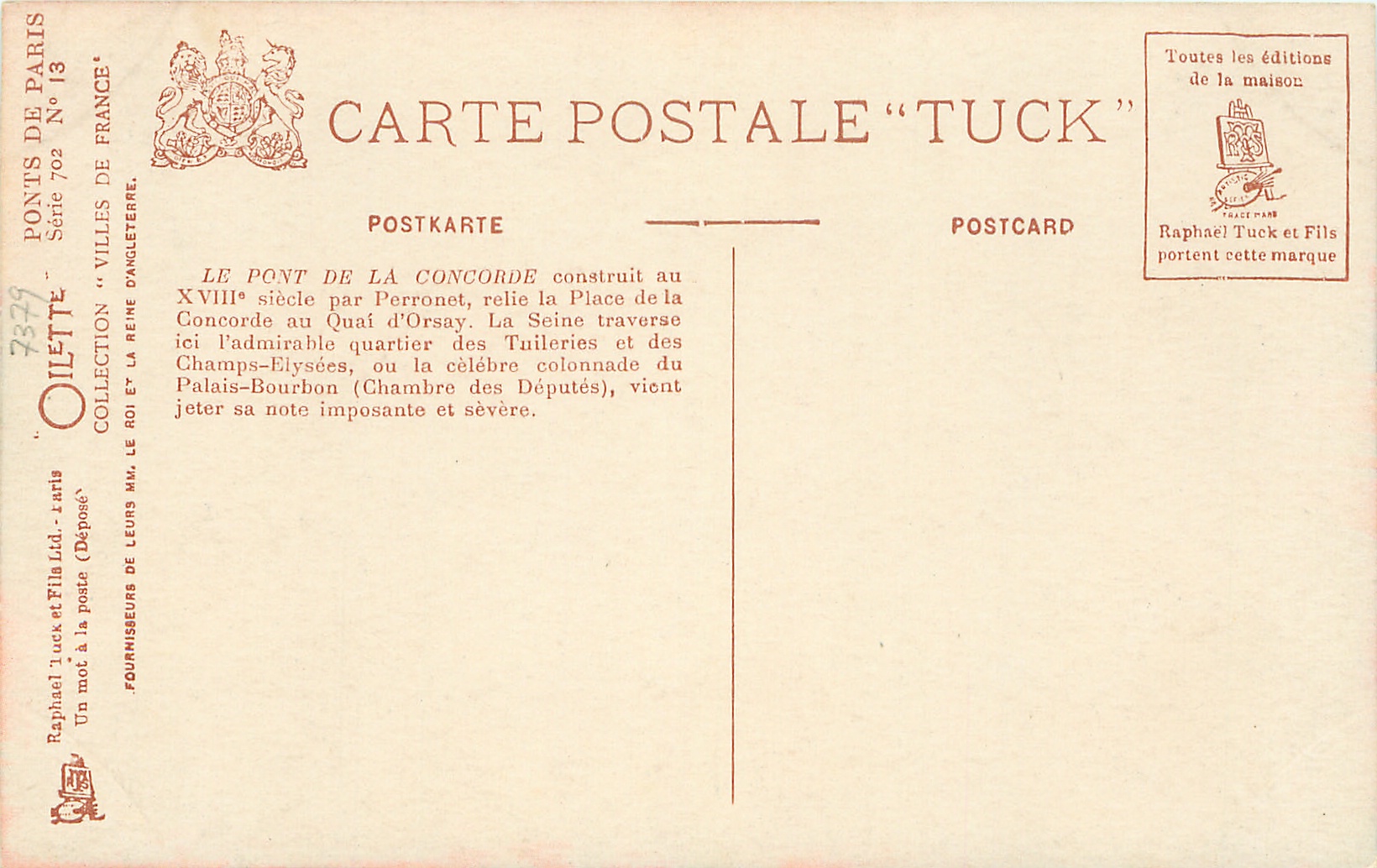 OILETTE, UN MOT A LA POSTE (DEPOSE), COLLECTION VILLES DE FRANCE, 3 backs, most of same images come in SERIE 702 without inset numbers, same images English backs OILETTE WIDE-WIDE-WORLD 7379 & 7380 PARIS BRIDGES I & II
