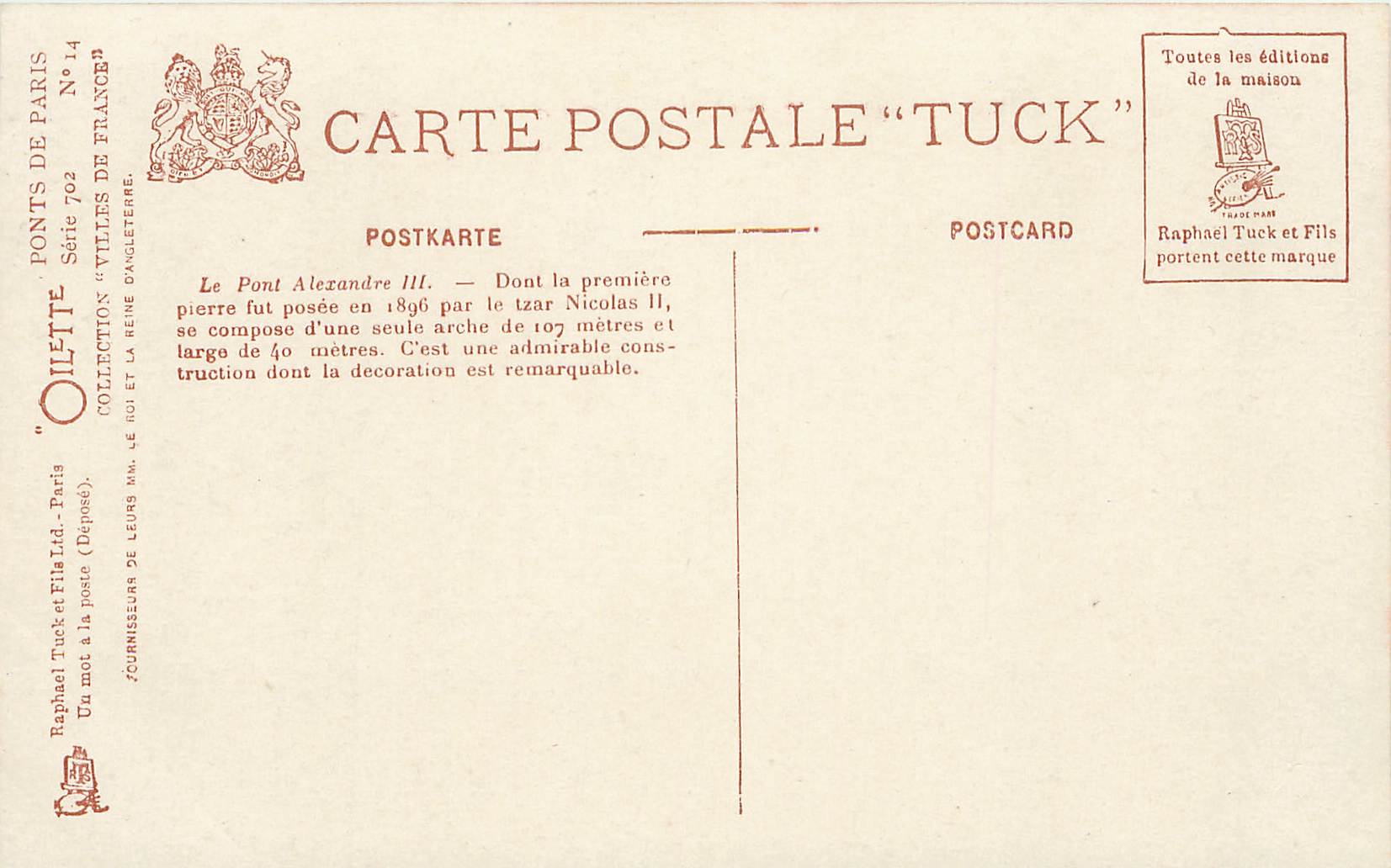 OILETTE, UN MOT A LA POSTE (DEPOSE), COLLECTION VILLES DE FRANCE, 3 backs, most of same images come in SERIE 702 without inset numbers, same images English backs OILETTE WIDE-WIDE-WORLD 7379 & 7380 PARIS BRIDGES I & II