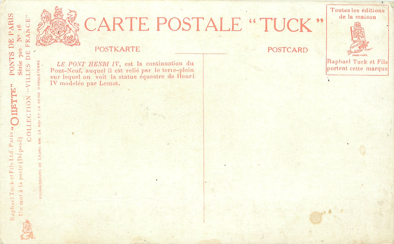 OILETTE, UN MOT A LA POSTE (DEPOSE), COLLECTION VILLES DE FRANCE, 3 backs, most of same images come in SERIE 702 without inset numbers, same images English backs OILETTE WIDE-WIDE-WORLD 7379 & 7380 PARIS BRIDGES I & II