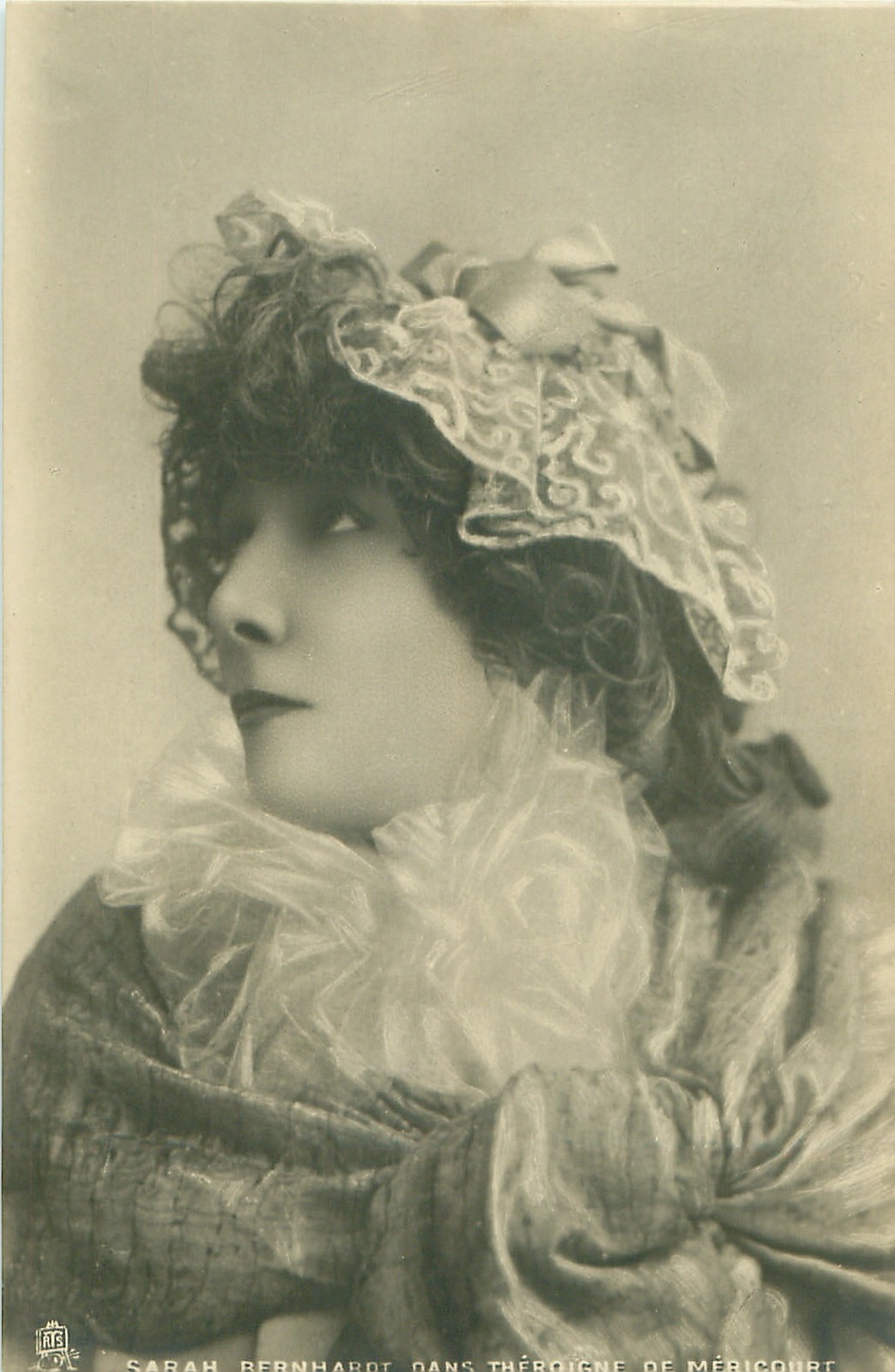 SARAH BERNHARDT head & shoulder study, she front, looks left, wearing lace fringed cap