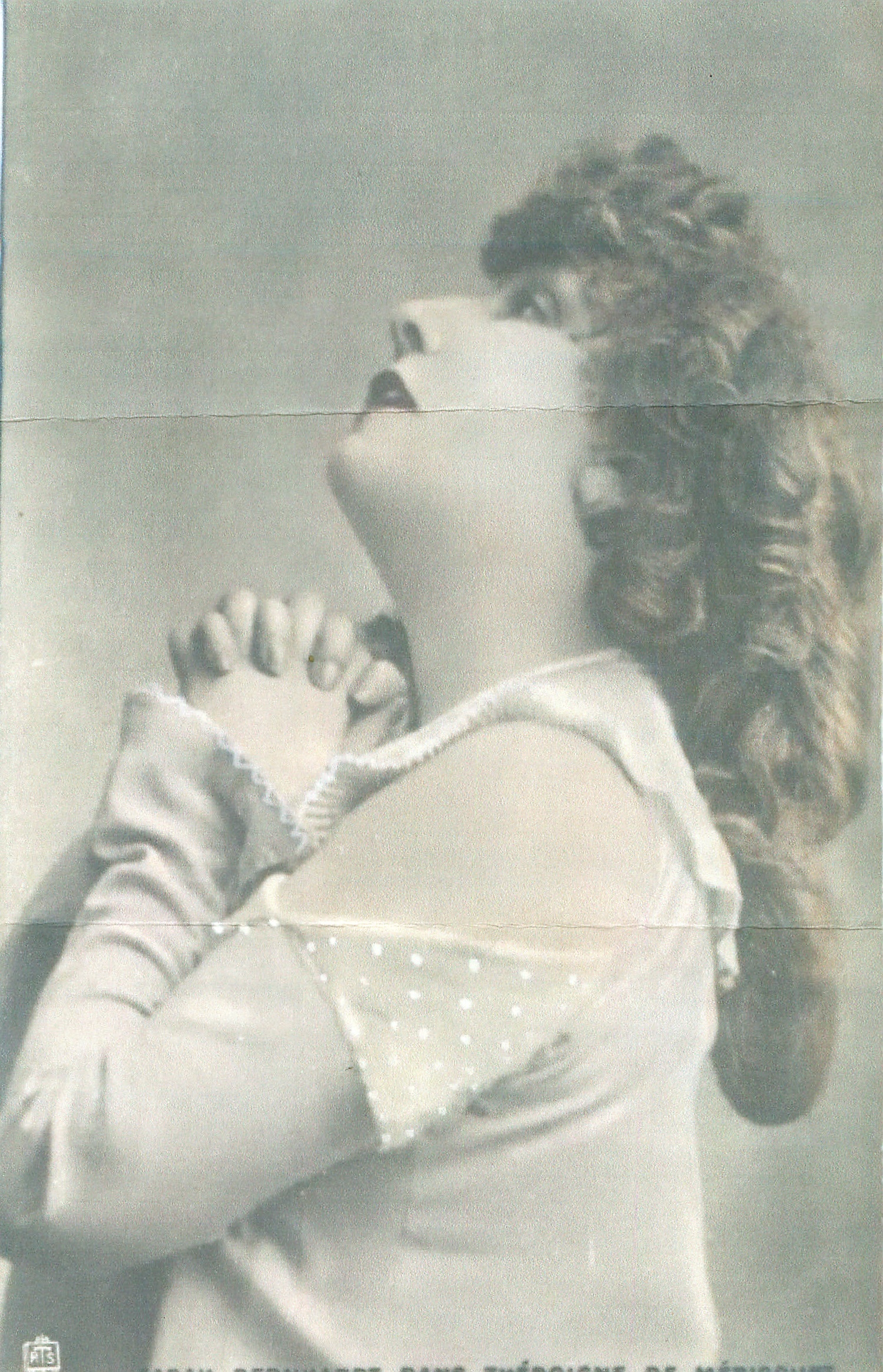 SARAH-BERNHARDT half length study, she looks up & left, hands clasped under her chin