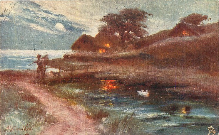 evening/night scene,fisherman & dog cross bridge over stream, two ducks, sea upper left