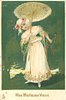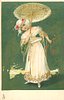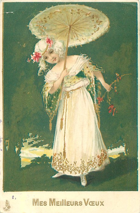pretty girl with flowers in band on her head, holds parasol in her right hand, flowers in her left