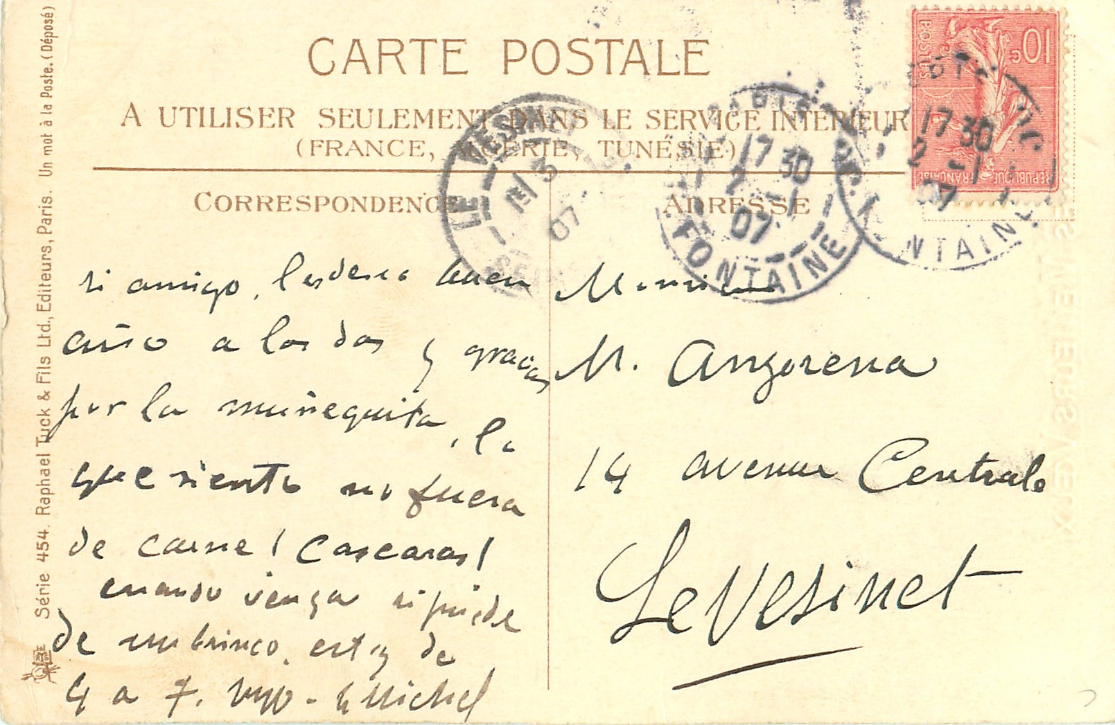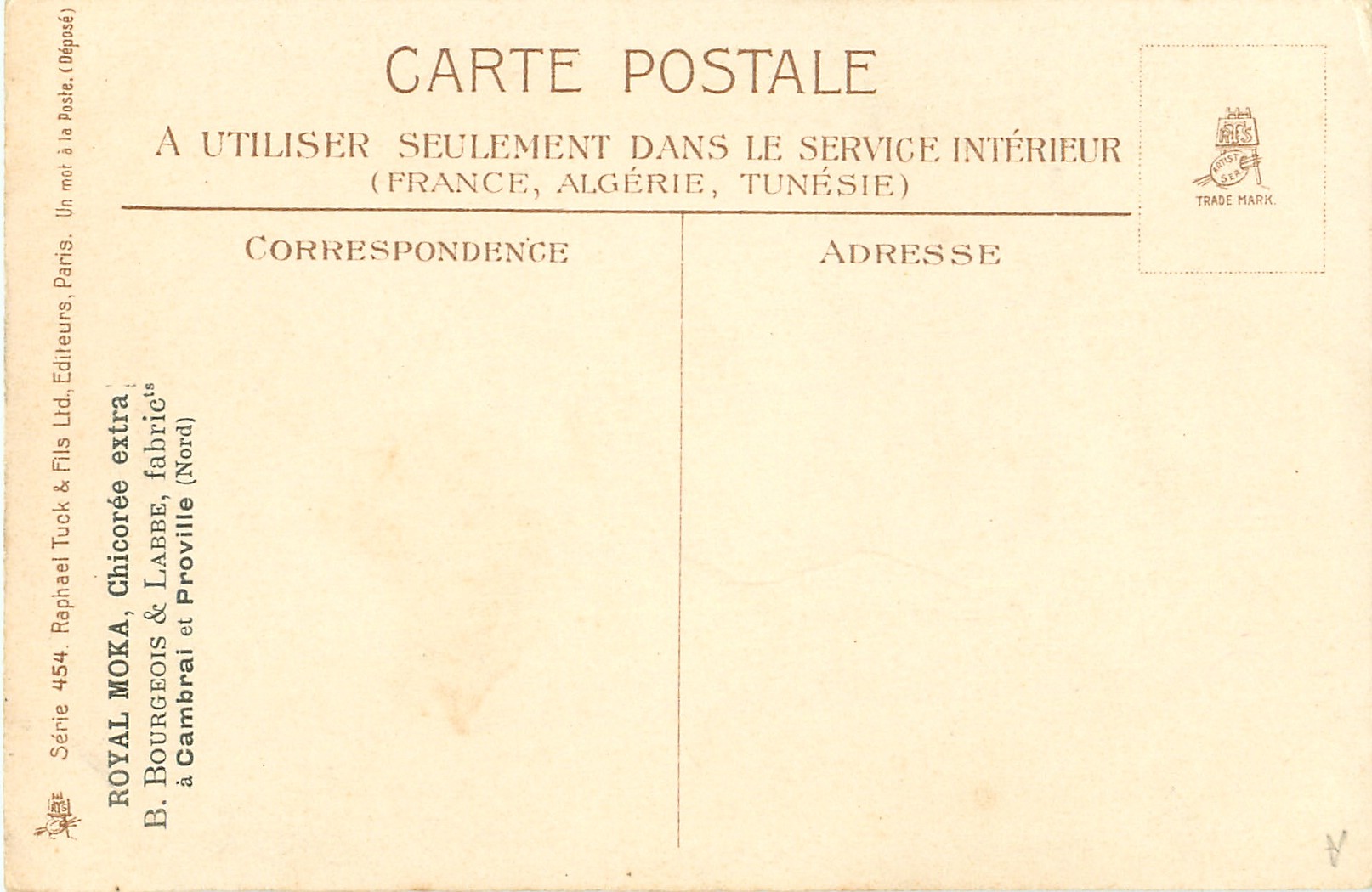 gilt, UN MOT A LA POSTE, (DEPOSE), come with advert. ROYAL MOKA, CHICOREE EXTRA, B. BOURGEOUS & LABBE, FABRIC A CAMBRAI ET PROVILLE (NORD), same image English back ART 1757