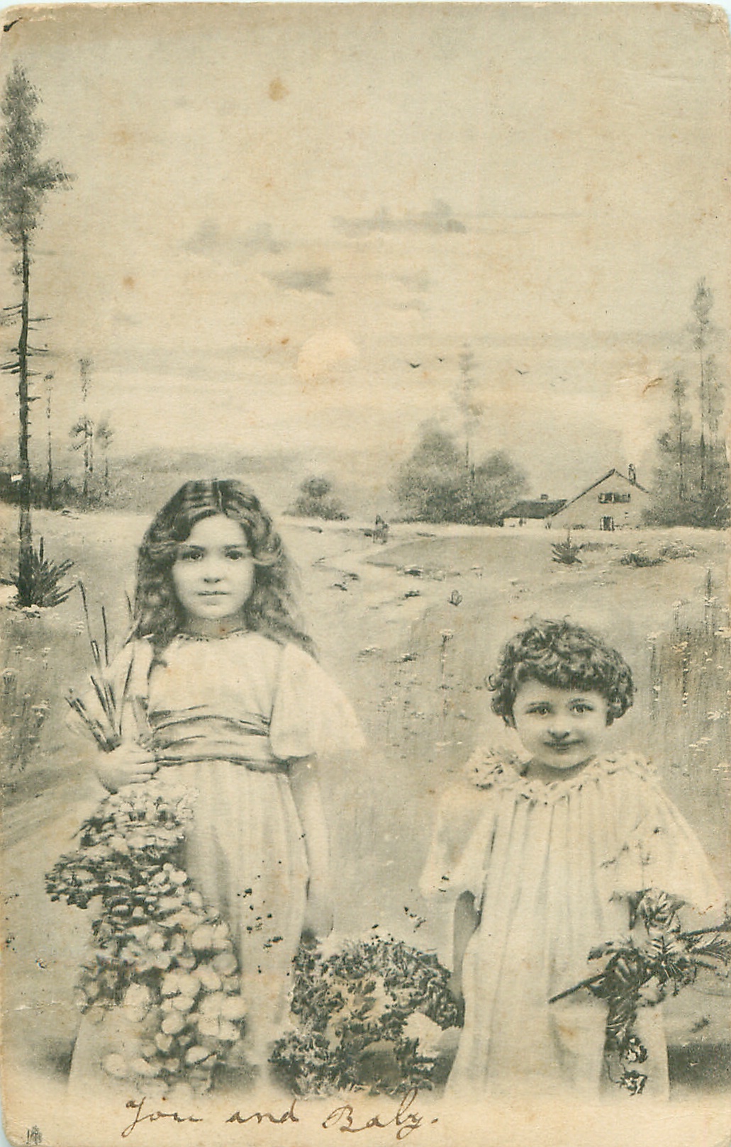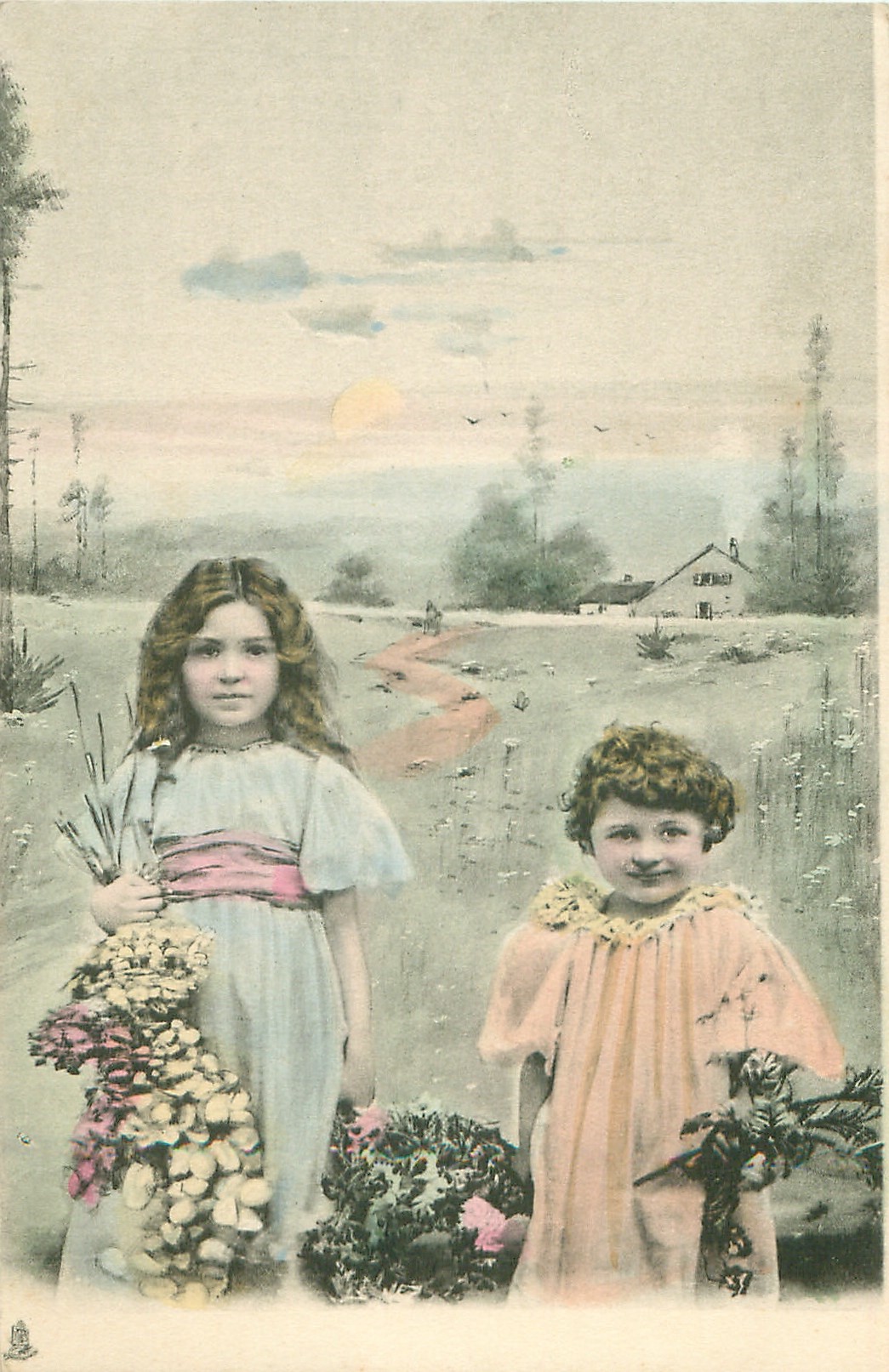 two children, girl left with large bundle of flowers held upside down by her right arm, smaller child holds sprig of evergreen, they hold a wreath between them