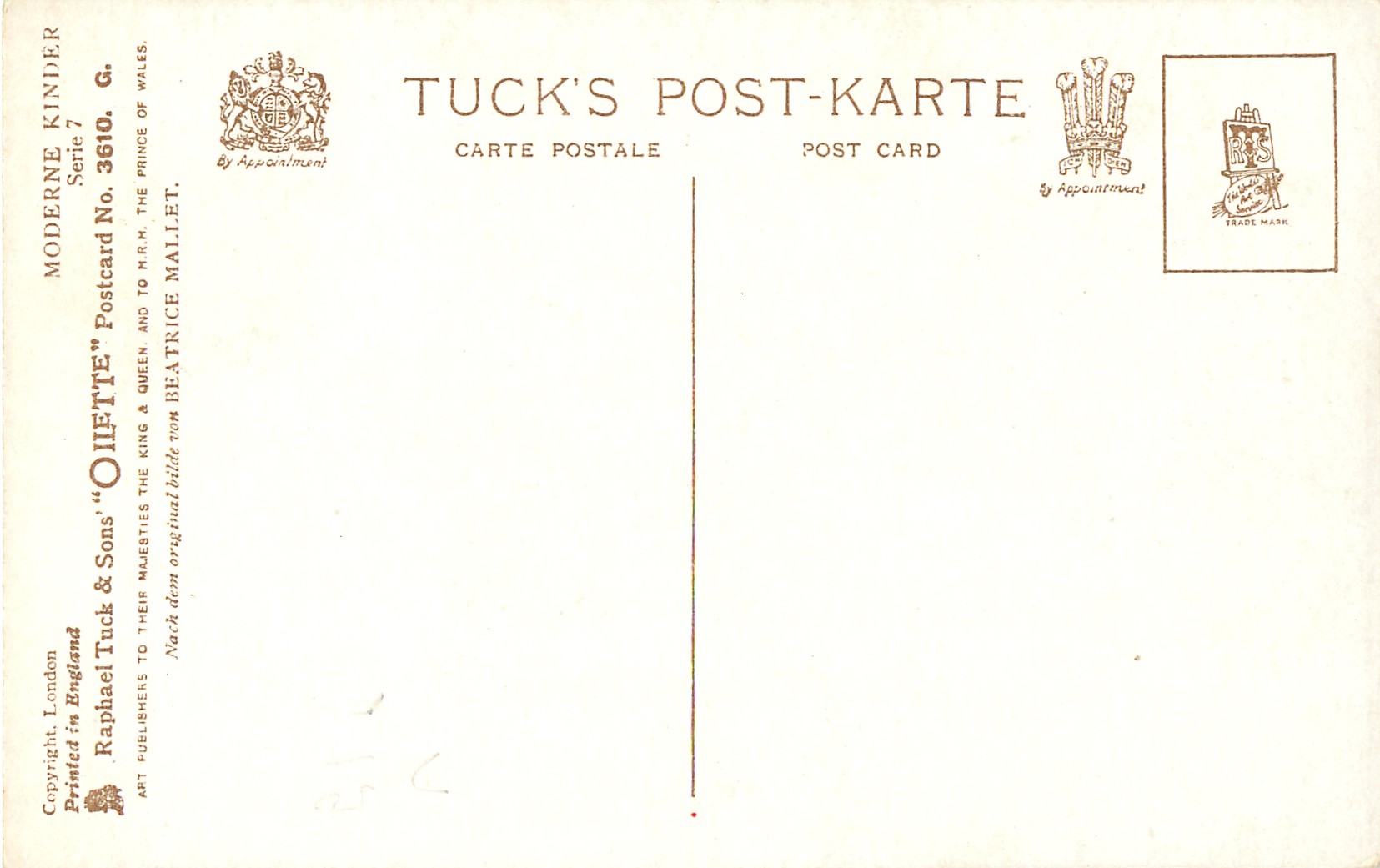 OILETTE, PRINTED IN ENGLAND, COPYRIGHT LONDON, NACH DEM ORIGINAL BILDE VON BEATRICE MALLET, G for German language, same image & number English back CUTE KIDDIES