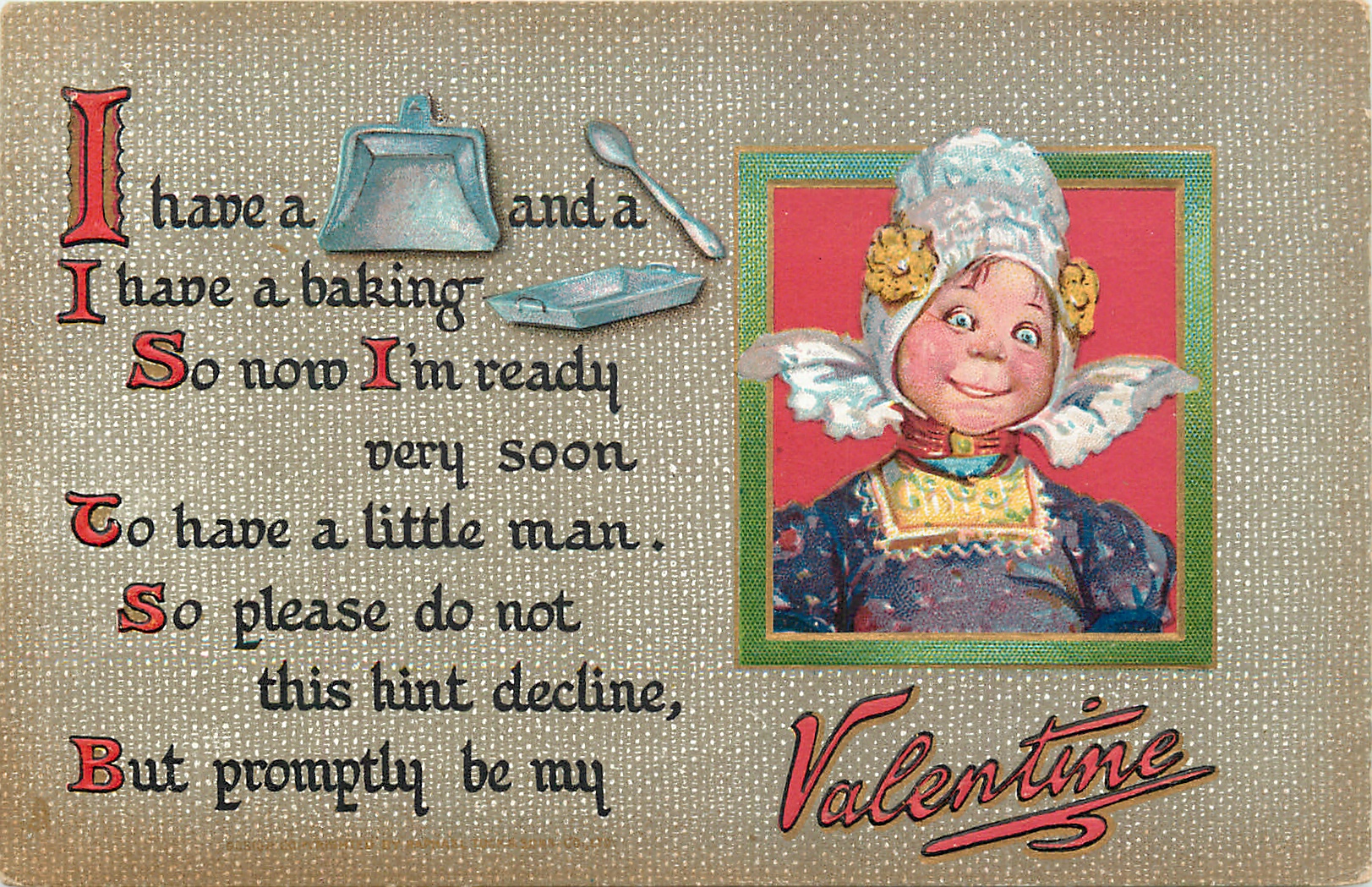 I HAVE A pan AND A spoon, I HAVE A BAKING pan SO NOW I'M READY VERY SOON TO HAVE A LITTLE MAN. SO PLEASE DO NOT THIS HINT DECLINE, BUT PROMPTLY BE MY VALENTINE