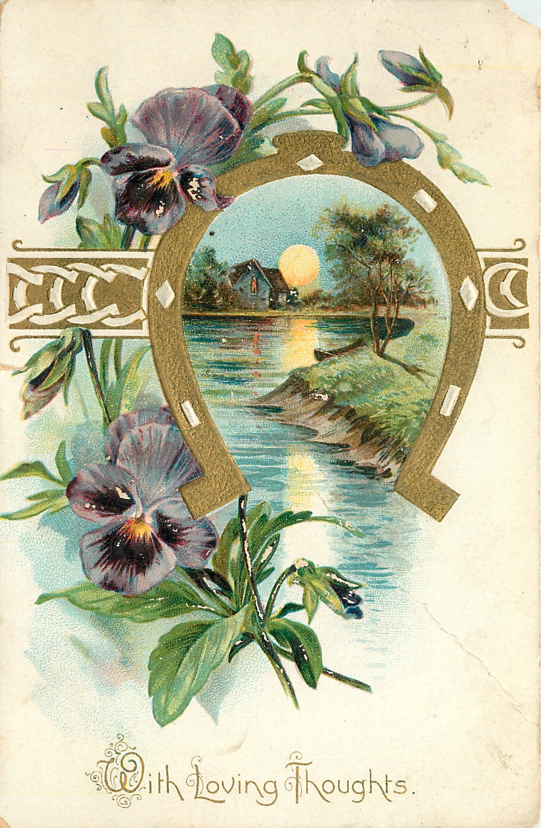 WITH LOVING THOUGHTS rural insert in gilt horseshoe, pansies
