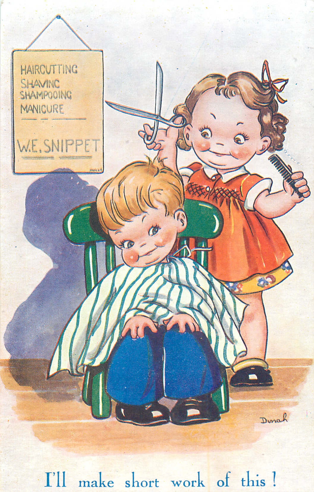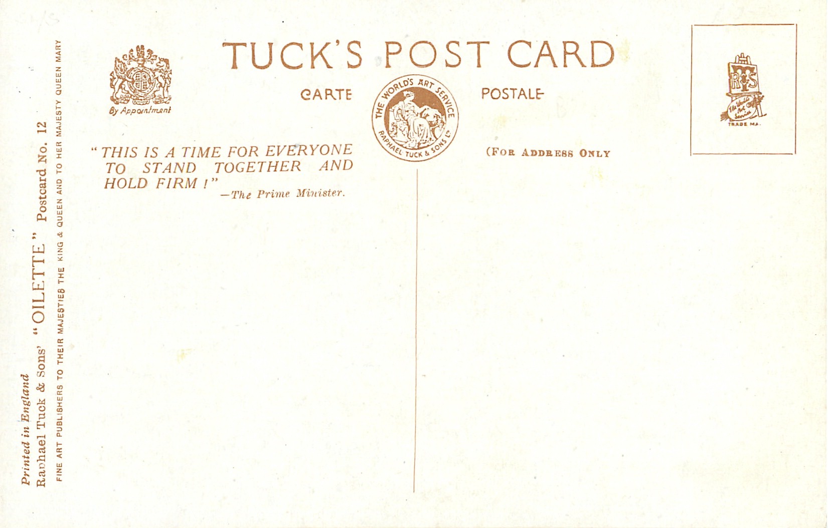 OILETTE, PRINTED IN ENGLAND, patriotic slogan on back, same image and title in set "comic children World War II period, unnumbered"
