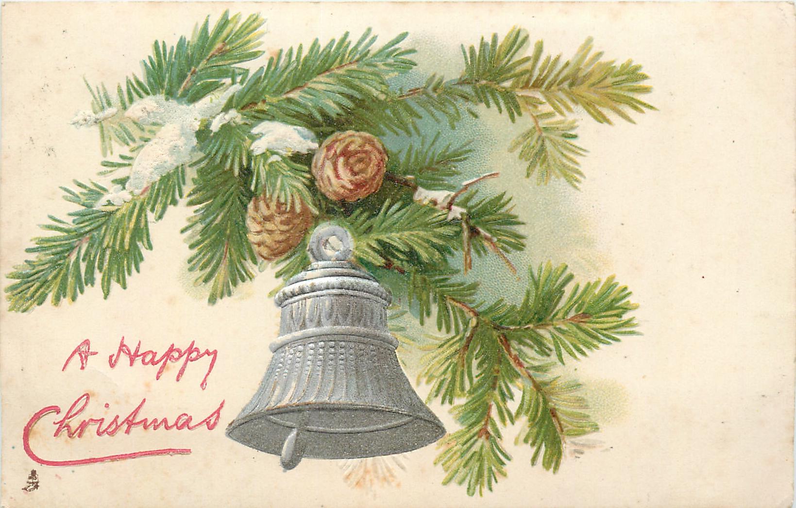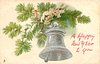 A HAPPY NEW YEAR TO YOU or A HAPPY CHRISTMAS silver bell suspended from evergreen tree branch