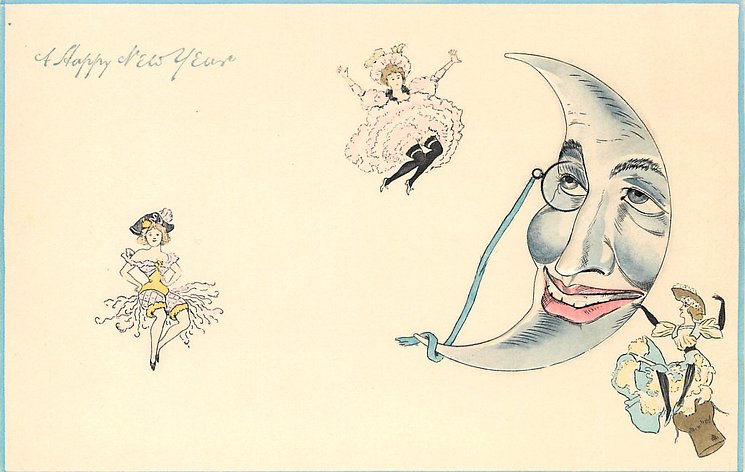 A HAPPY NEW YEAR man in the moon with monacle smiles, three girls float around in space