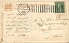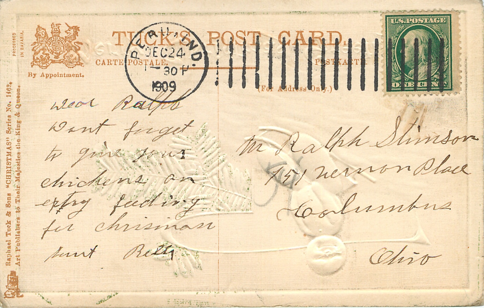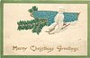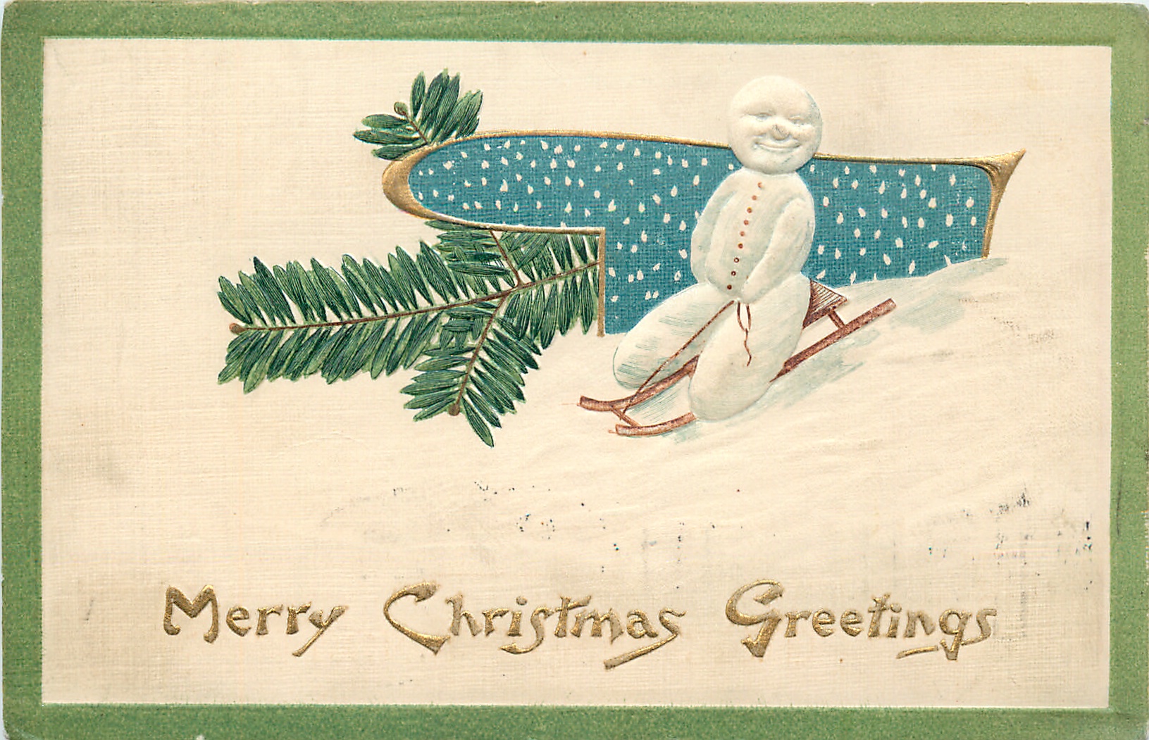 MERRY CHRISTMAS GREETINGS snowman on sled, evergreen left