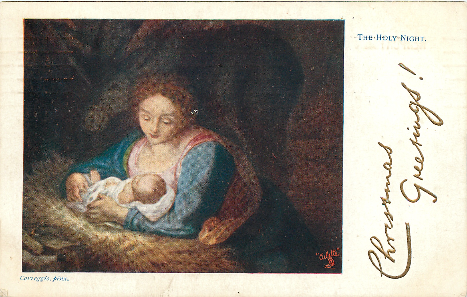 comes opt. in gilt or red CHRISTMAS GREETINGS!, in gilt JOYEUX NOEL, comes gilt around card edges