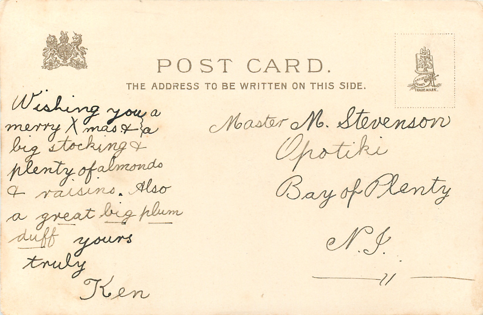 u/b, DESIGNED IN ENGLAND, CHROMOGRAPHED IN GERMANY, listed in RAPHAEL TUCK & SONS' LD. CHRISTMAS & NEW YEAR 1904/1905 catalogue