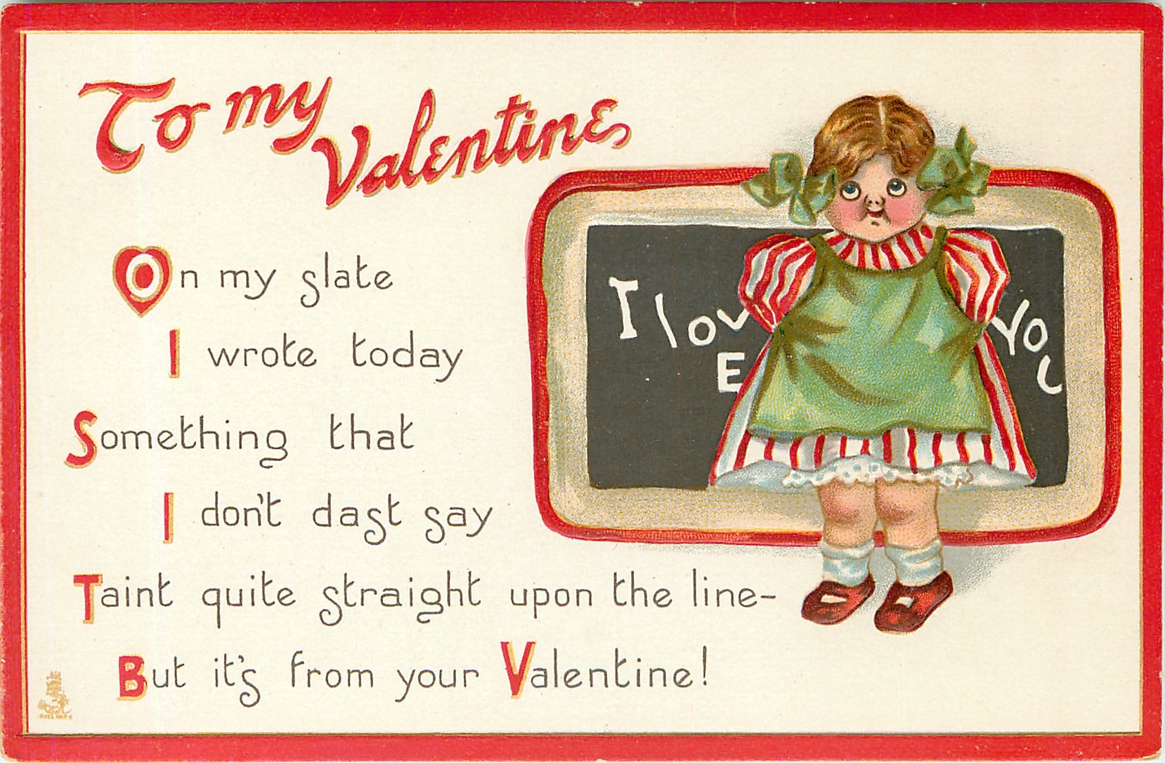 TO MY VALENTINE ON MY SLATE I WROTE TODAY SOMETHING THAT I DON'T DAST SAY TAINT QUITE STRAIGHT UPON THE LINE--BUT IT'S FROM YOUR VALENTINE!