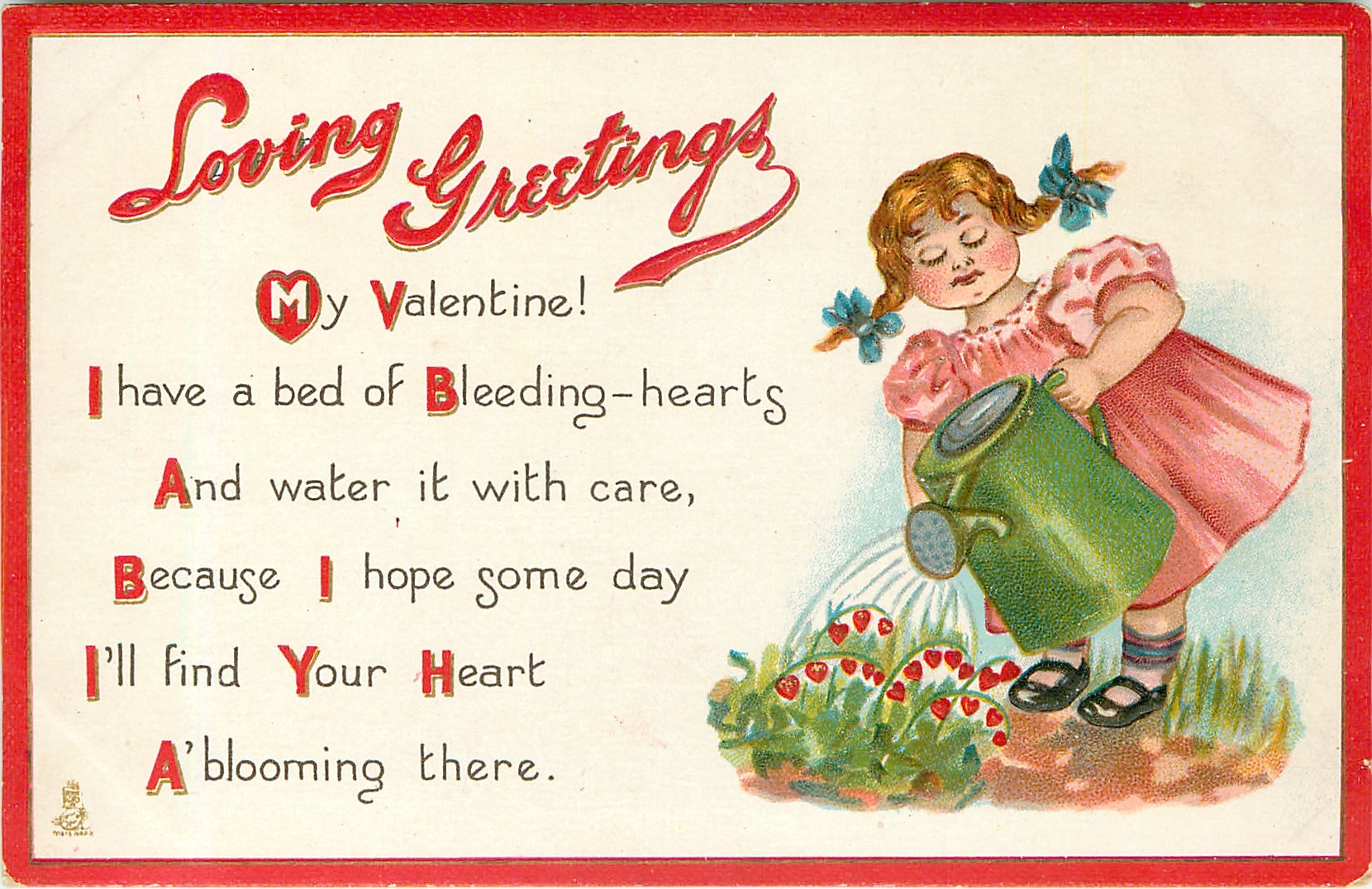 LOVING GREETINGS MY VALENTINE! I HAVE A BED OF BLEEDING-HEARTS AND WATER IT WITH CARE, BECAUSE I HOPE SOME DAY I'LL FIND YOUR HEART A'BLOOMING THERE.