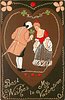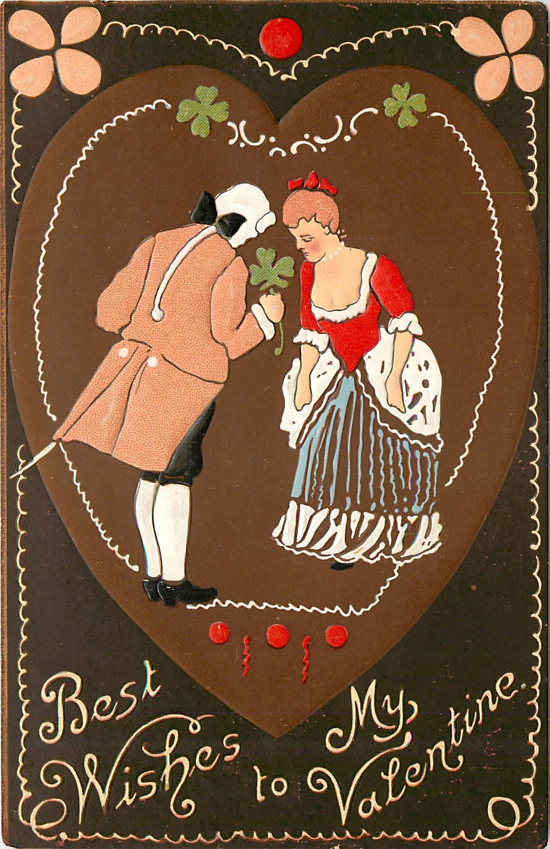 BEST WISHES TO MY VALENTINE couple in old style dress bow to each other, ornate decorations