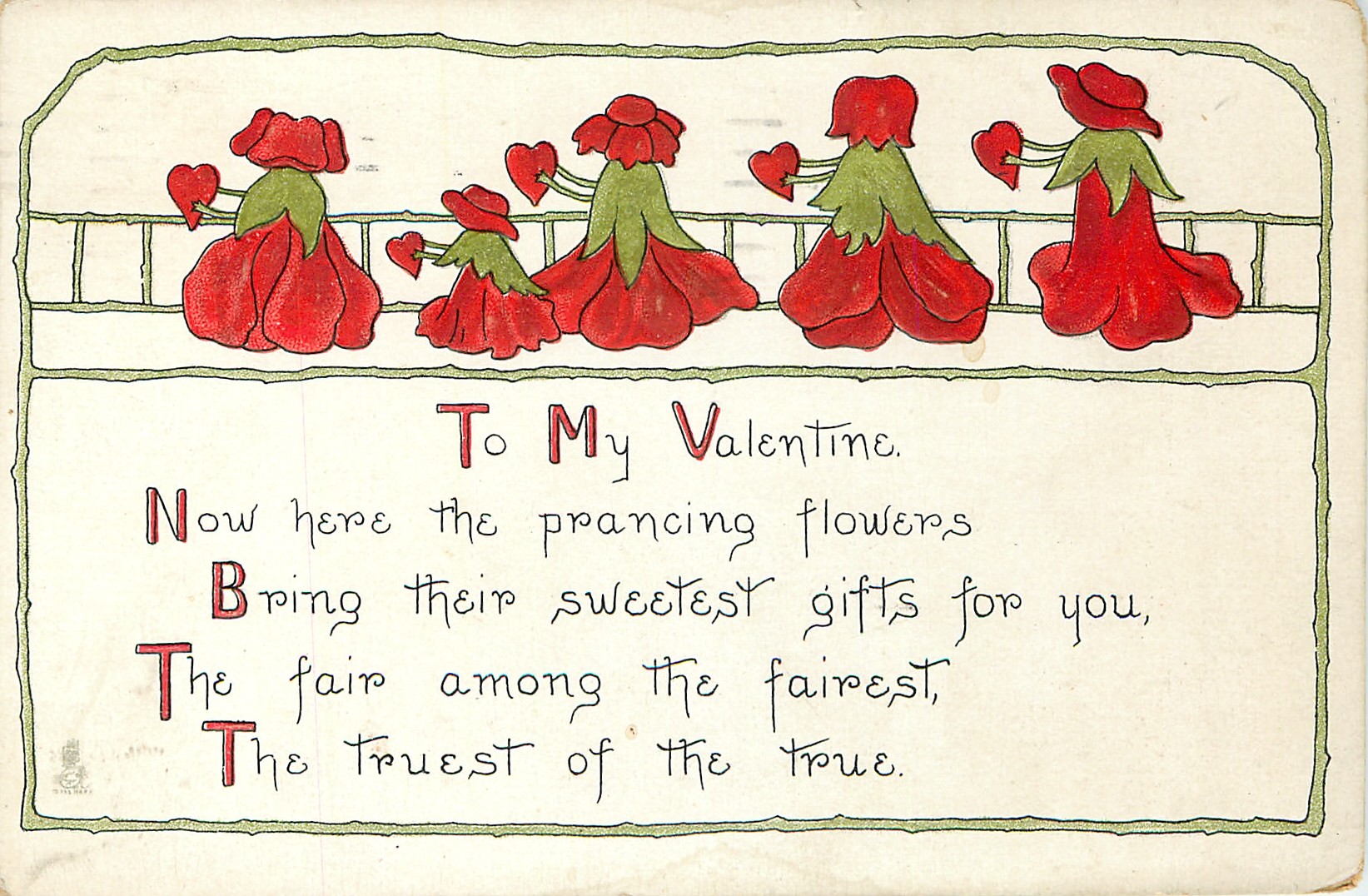 TO MY VALENTINE. NOW HERE THE PRANCING FLOWERS BRING THEIR SWEETEST GIFTS FOR YOU, THE FAIR AMONG THE FAIREST, THE TRUEST OF THE TRUE.