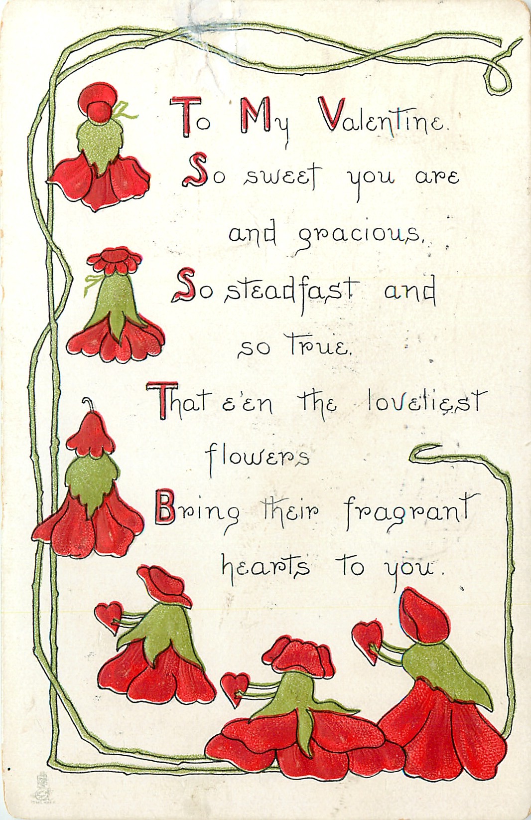 TO MY VALENTINE. SO SWEET YOU ARE AND GRACIOUS, SO STEADFAST AND SO TRUE, THAT E'EN THE LOVIEST FLOWERS BRING THEIR FRAGRANT HEARTS TO YOU