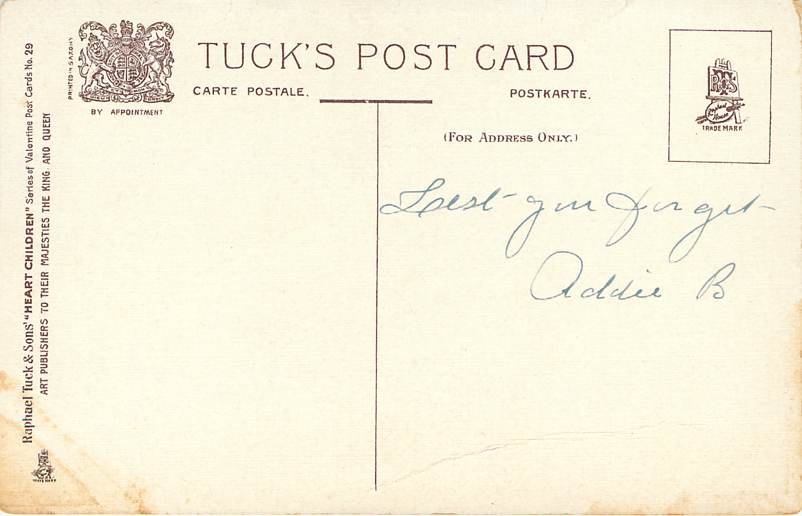 A VALENTINE FOR A SWEET GIRL, boy & girl in sunbonnets face each other & hold hands in front of red heart