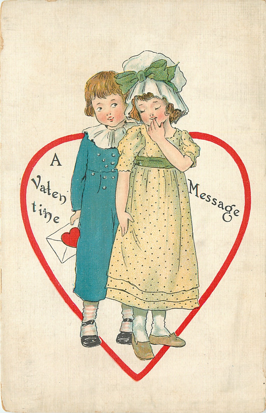 A VALENTINE MESSAGE, boy & girl stand close, he has valentine for her