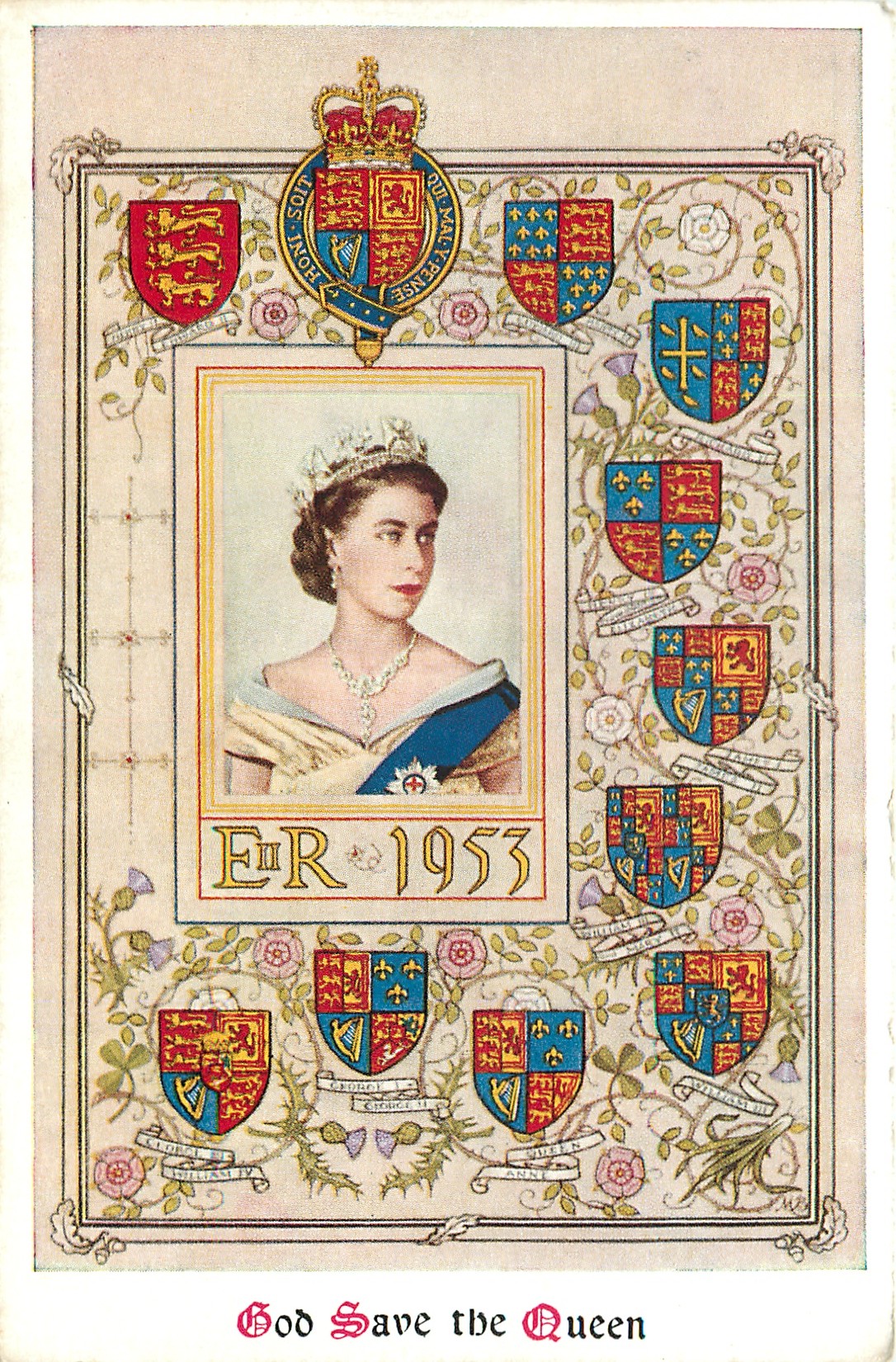GOD SAVE THE QUEEN head and shoulders view in Coat of Arms frame, E II R 1953