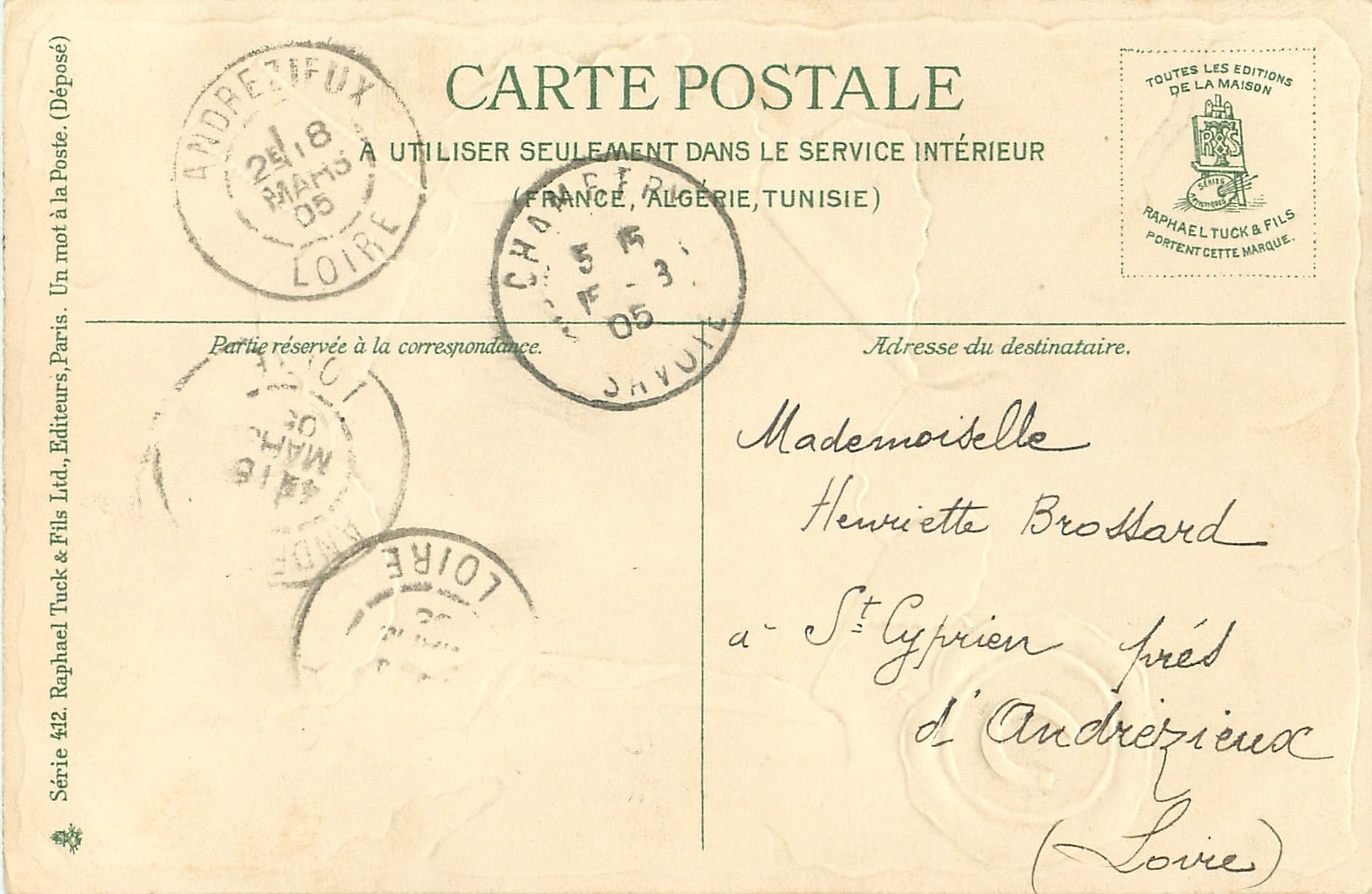 UN MOT A LA POSTE, (DEPOSE) insets of animals seen through a window torn in parchment, green borders & embossed lucky green horseshoe seal