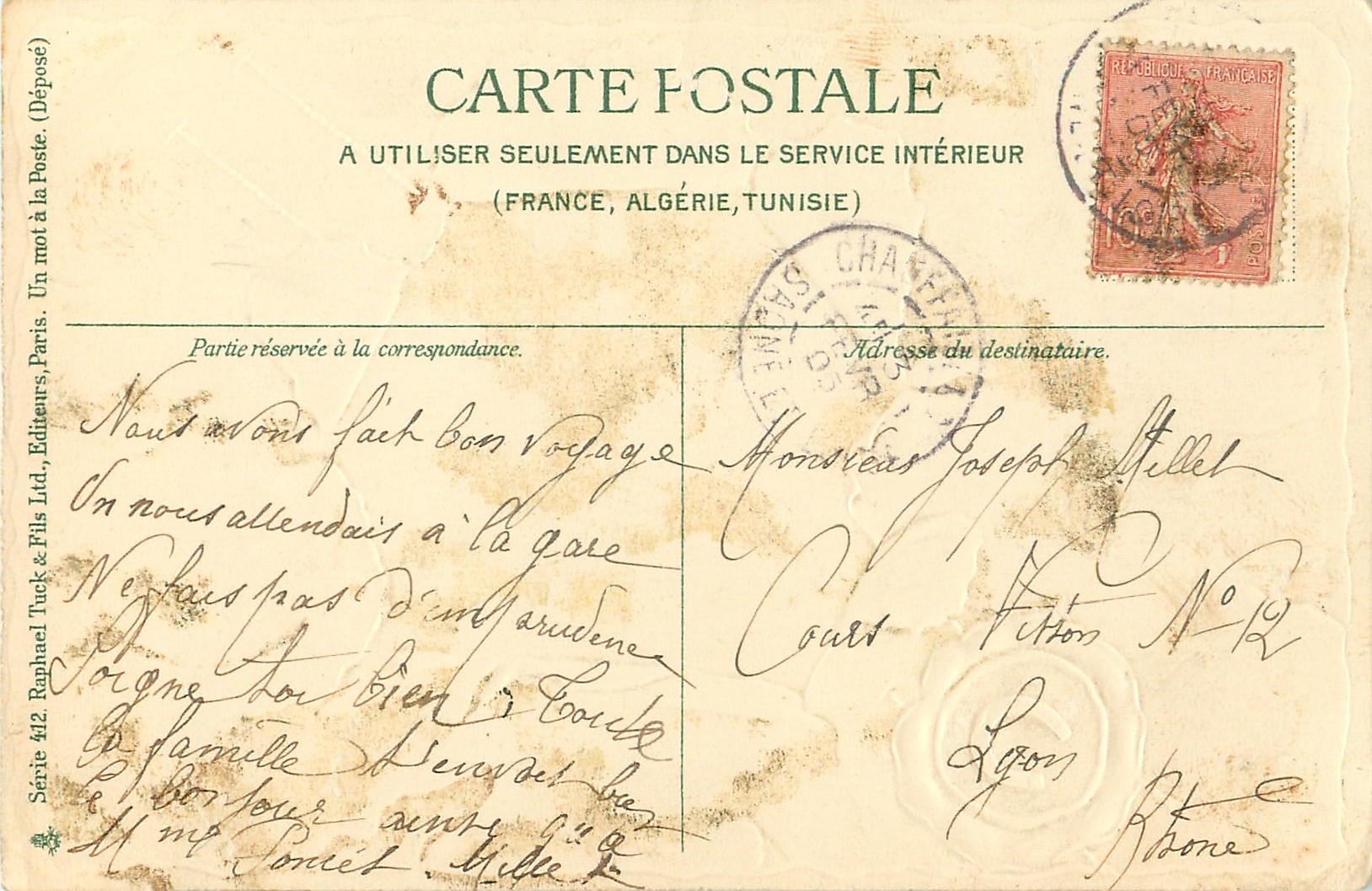 UN MOT A LA POSTE, (DEPOSE) insets of animals seen through a window torn in parchment, green borders & embossed lucky green horseshoe seal