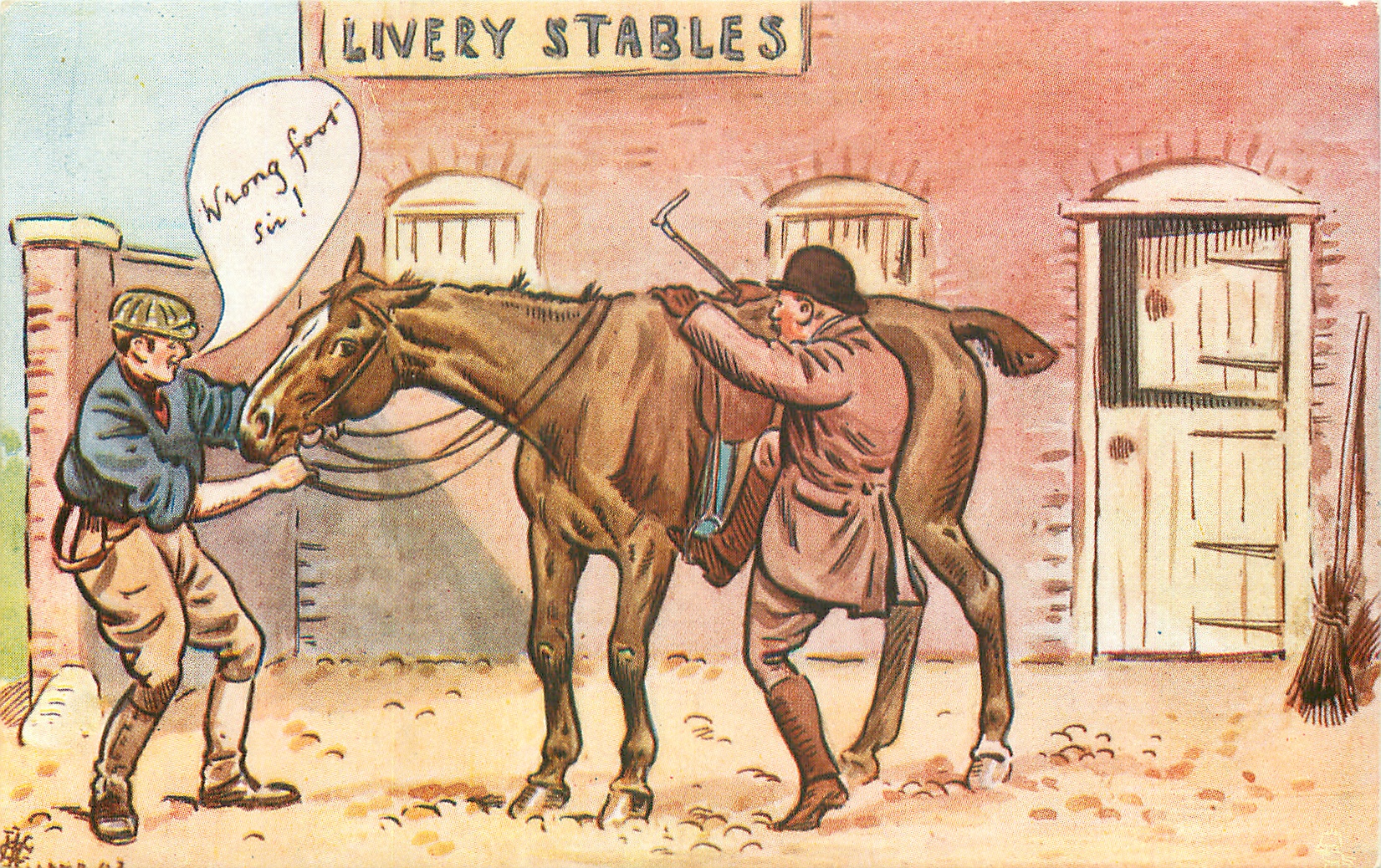 WRONG FOOT SIR! man attempts to mount putting wrong foot in stirrup