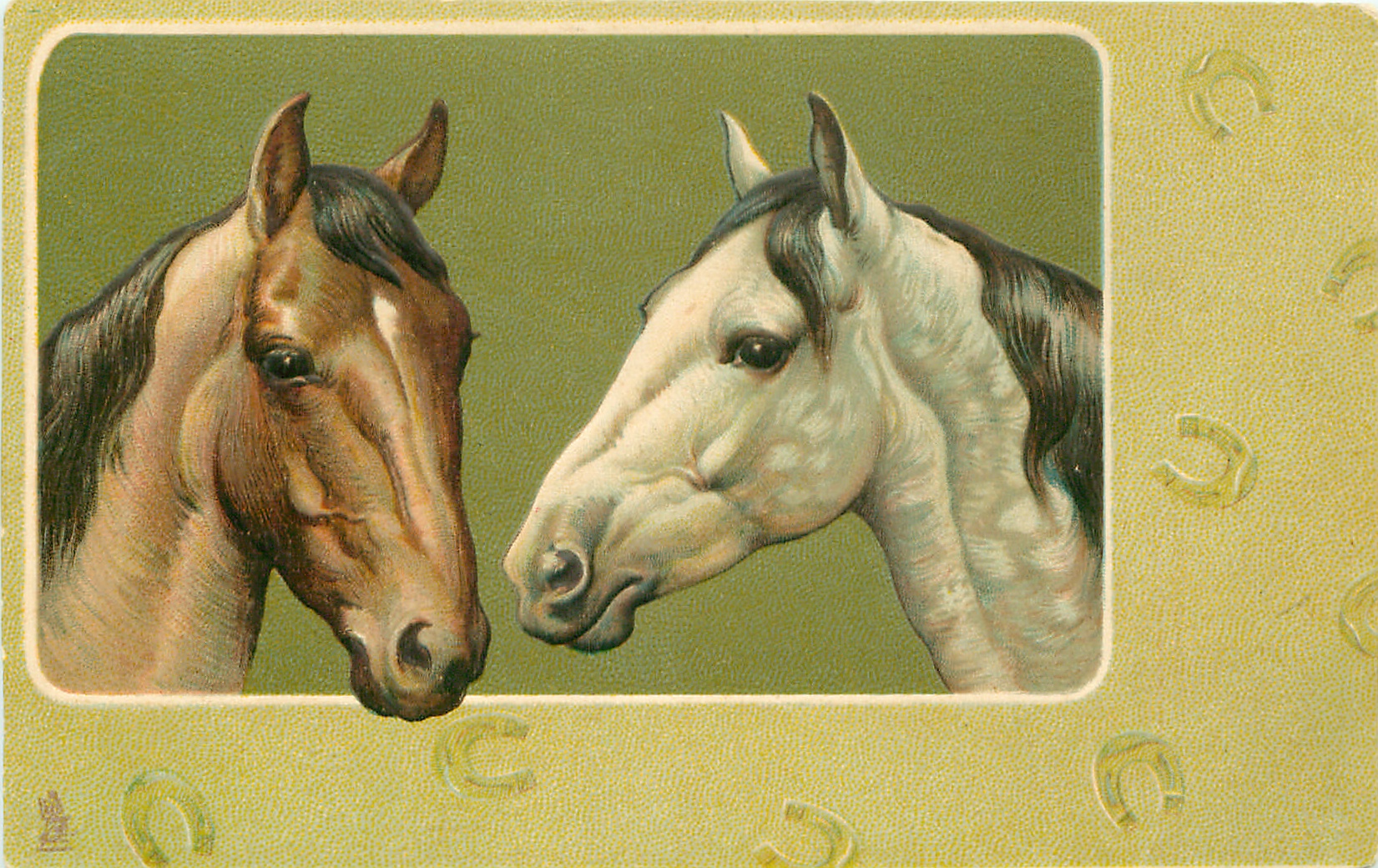 embossed, UN MOT A LA POSTE, (DEPOSE), horseshoes on green background as surround