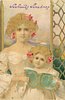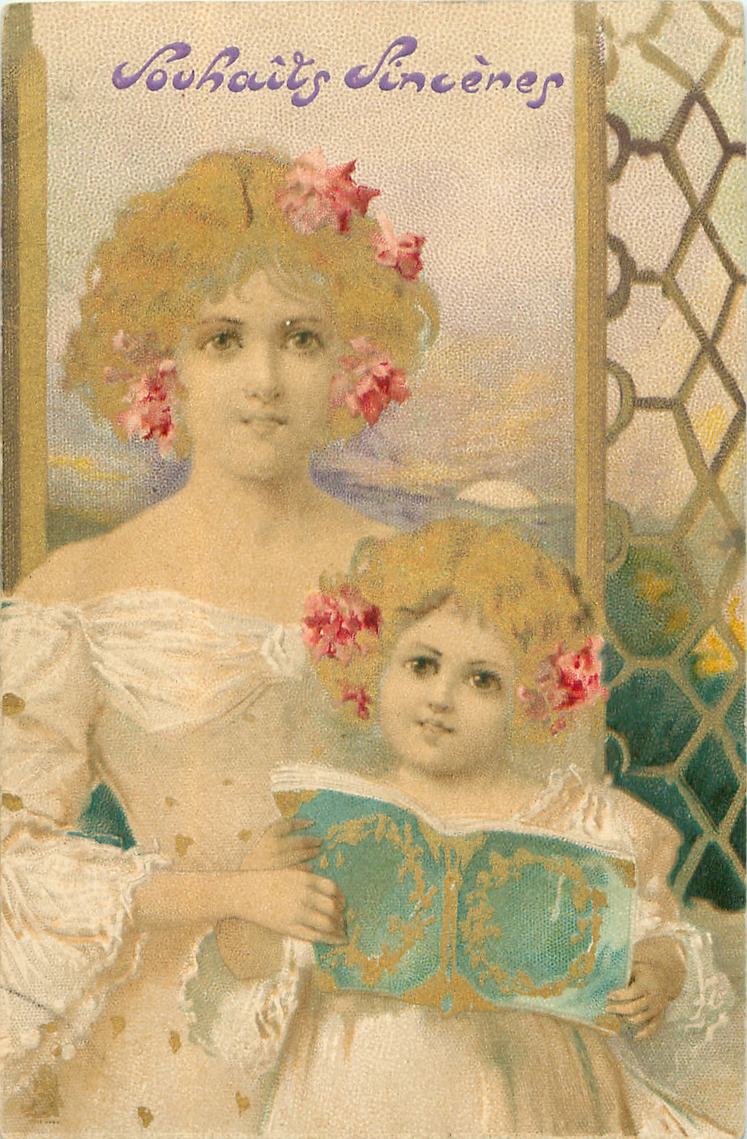 mother & girl in white dresses stand looking front, they hold up a blue book, window & seascape behind
