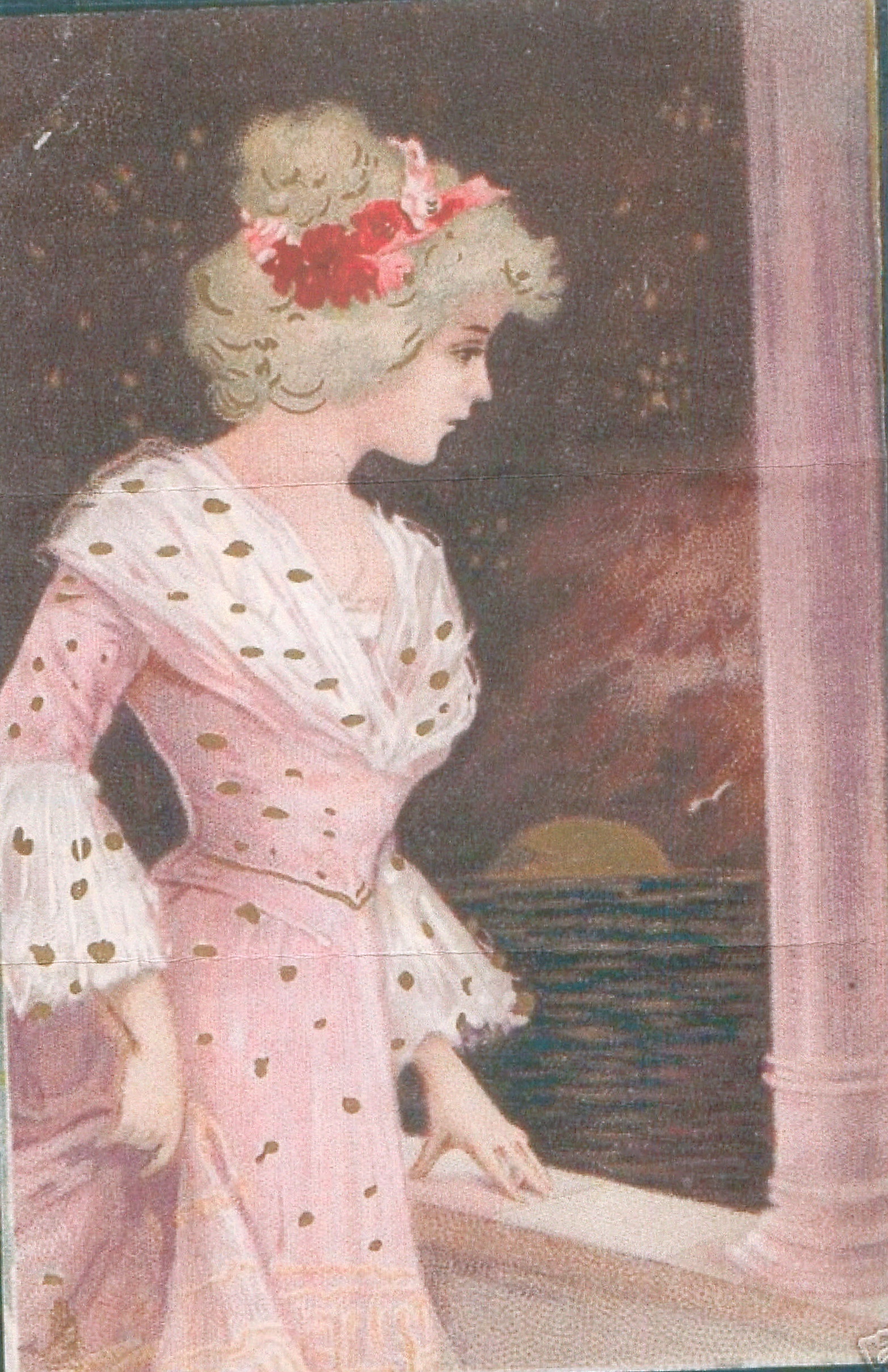 pretty girl in pink with white/gold trim, standing facing right kooking out to sea from balcony, moon on horizon
