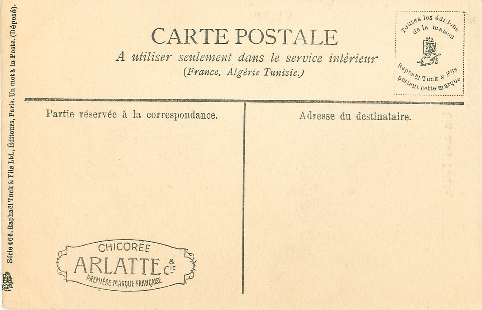 UN MOT A LA POSTE, (DEPOSE), come hand-coloured, comes with CHICOREE ARLATTE ad. on back