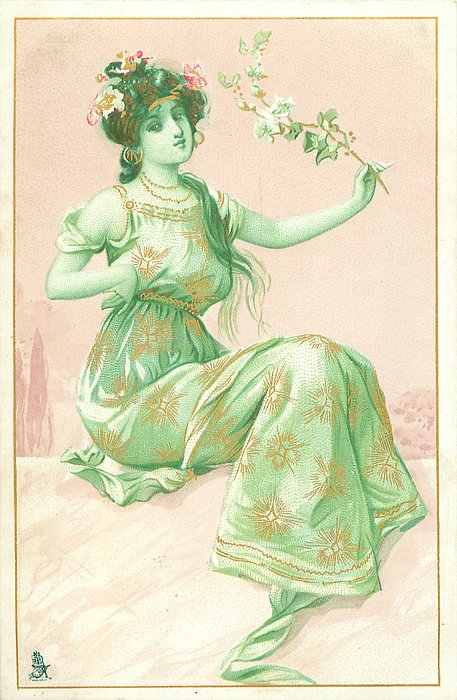 young woman in off-the-shoulder green dress, seated on parapet, facing front/right, looks front, holding flower spray in her left hand, holfing her right hand bent up on her chest