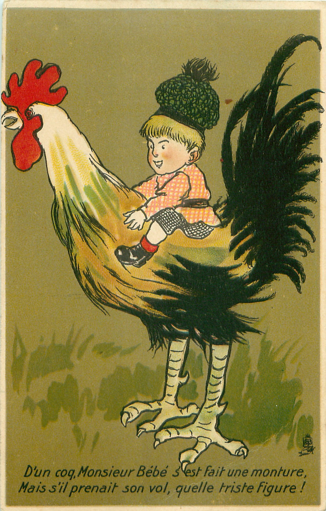 D'UN COQ, MONSIEUR BEBE S'EST FAIT UNE MONTURE, MAIS S'IL PRENAIT SON VOL, QUELLE TRISTE FIGURE! young boy rides monster cockerel