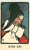 RIRE GAI smiling man with large white bow tie, black cap, in red coat, facing right, looking front