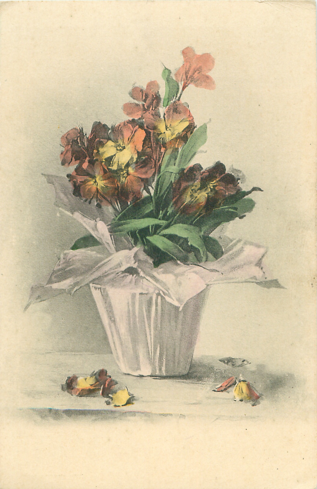 pot of multicoloured wallflowers, decorated & wrapped with light pink paper