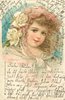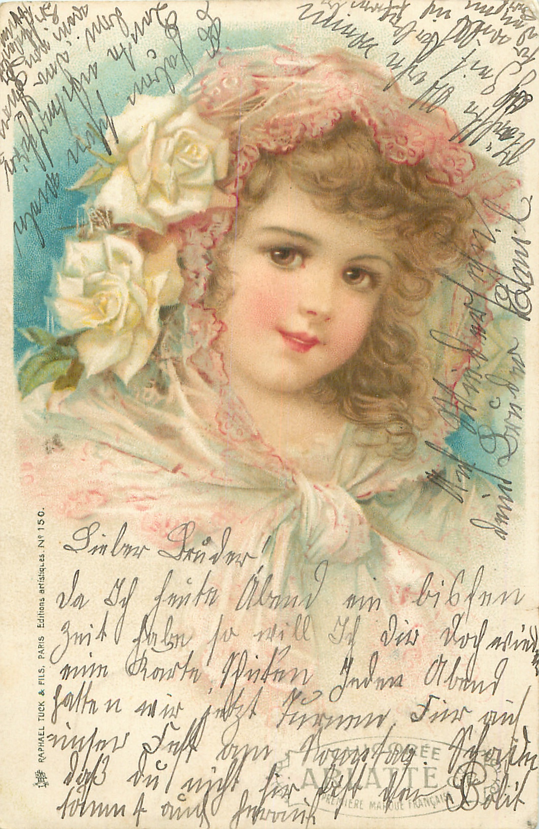 head & shoulder study of young girl in white dress, filmy scarf over head & round neck, white roses over right ear