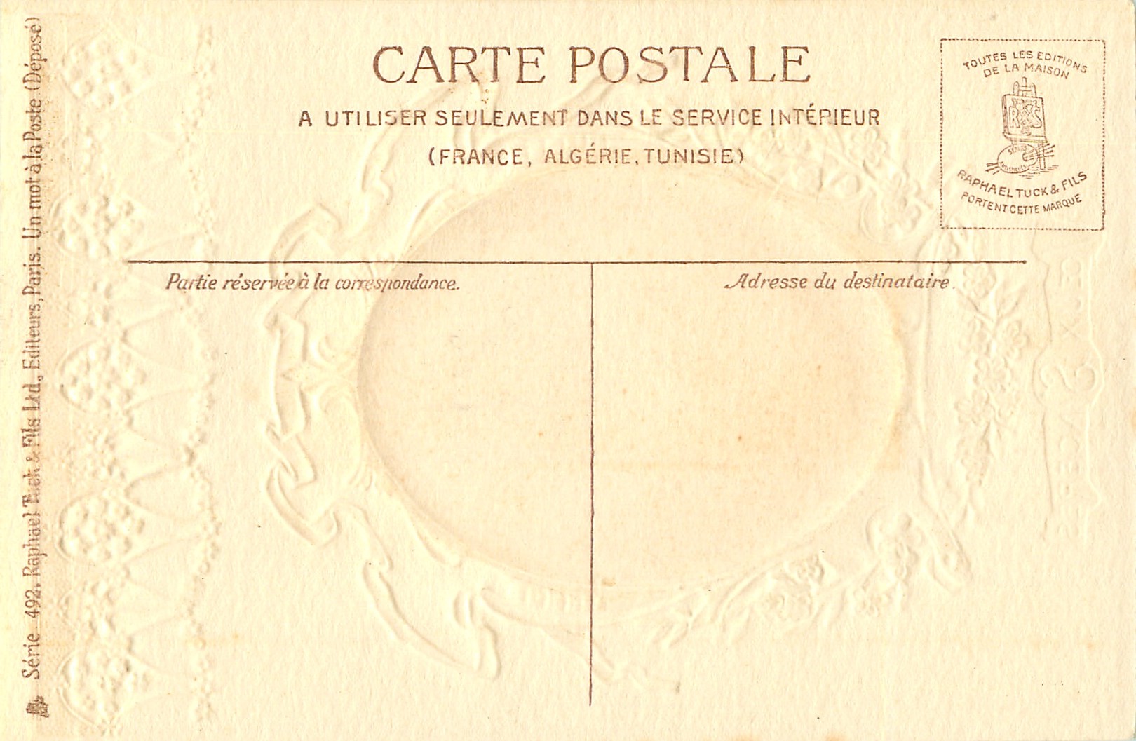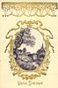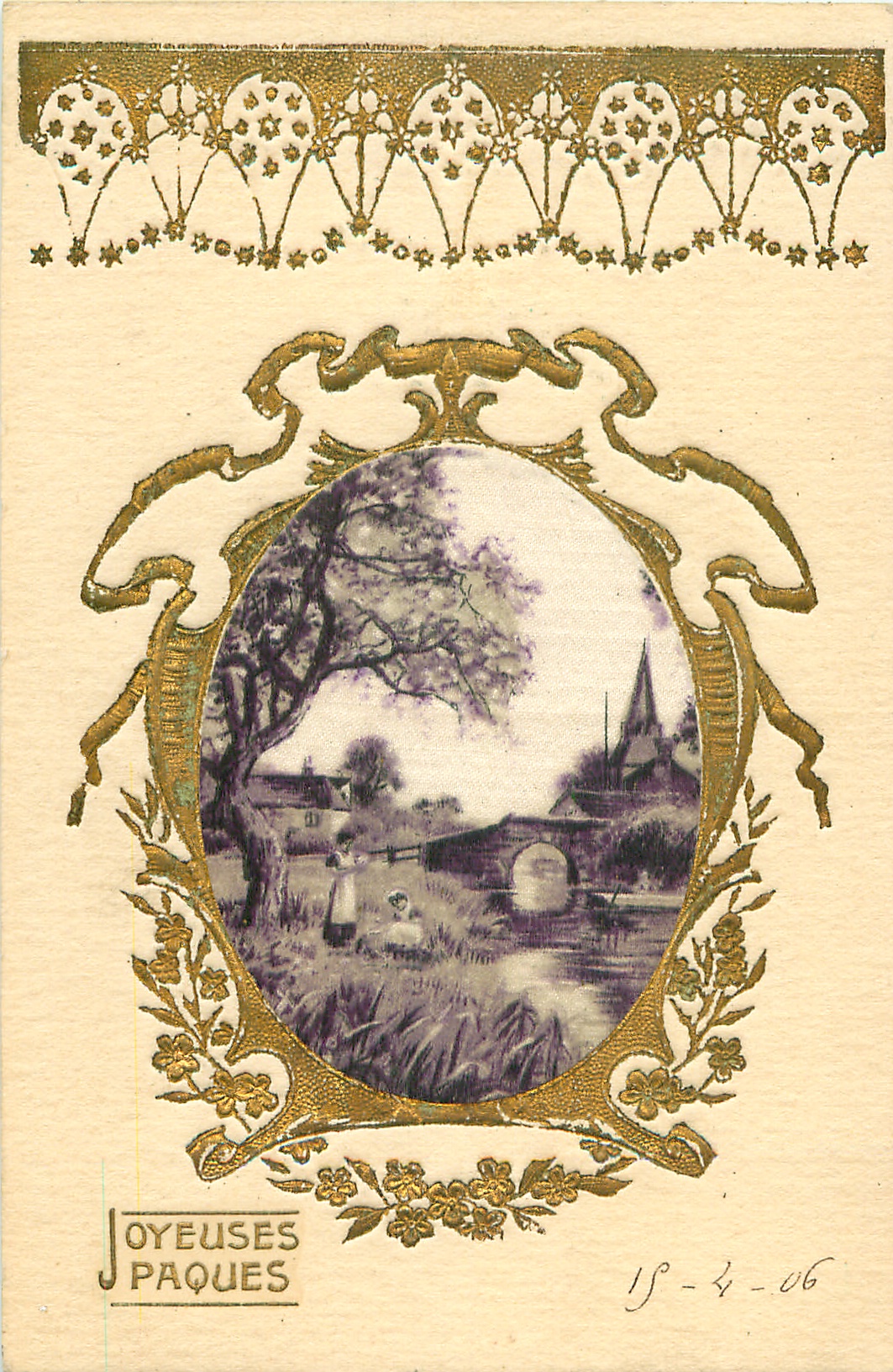 gilt embossed elaborate nouveau gilt decoration around oval silk insets, UN MOT A LA POSTE, (DEPOSE), vignettes come in green or purple