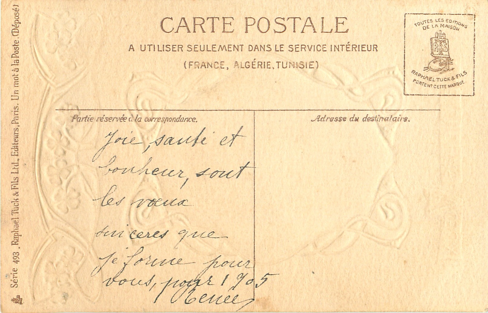gilt embossed elaborate nouveau gilt decoration around irregular deep blue or brown silk insets, UN MOT A LA POSTE, (DEPOSE)