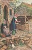 girl draws water from well, woman seated left lacemaking, duck lower front