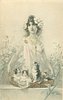 Lisette stands behind wall holding basket containing four kittens, roses around